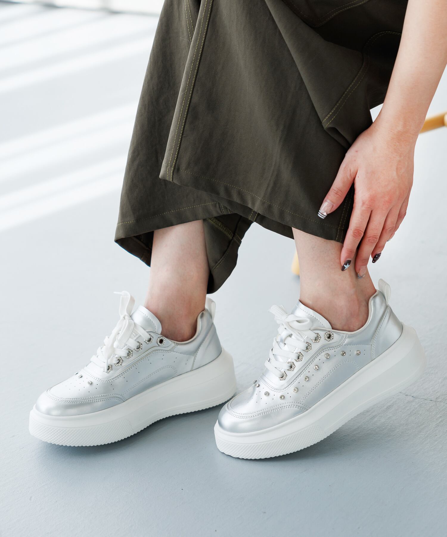 アッパーのストーンパーツが目を引く厚底スニーカー。