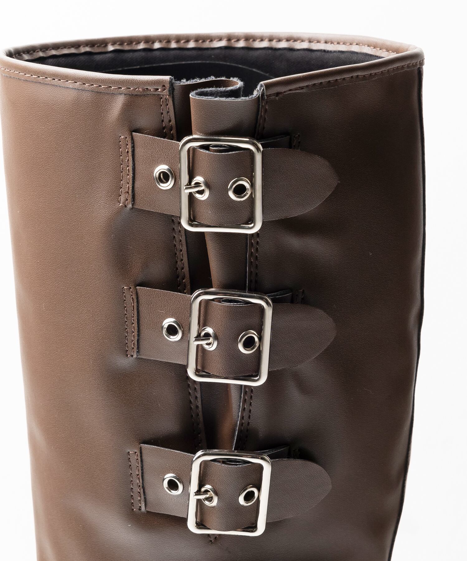 サイドに複数のベルトを組み合わせたロックな印象のロングブーツ。