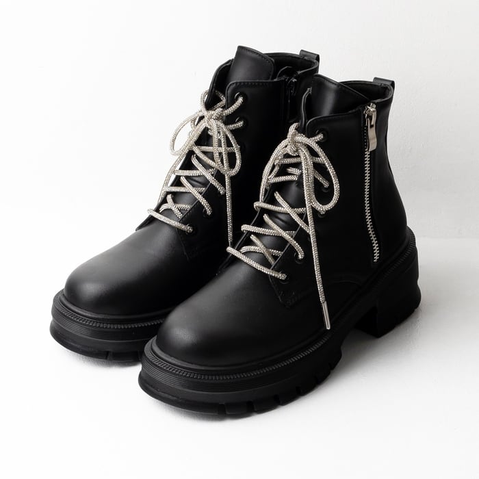 キラキラのラインストーンのシューレースが目を引くレースアップブーツ。
