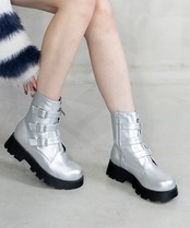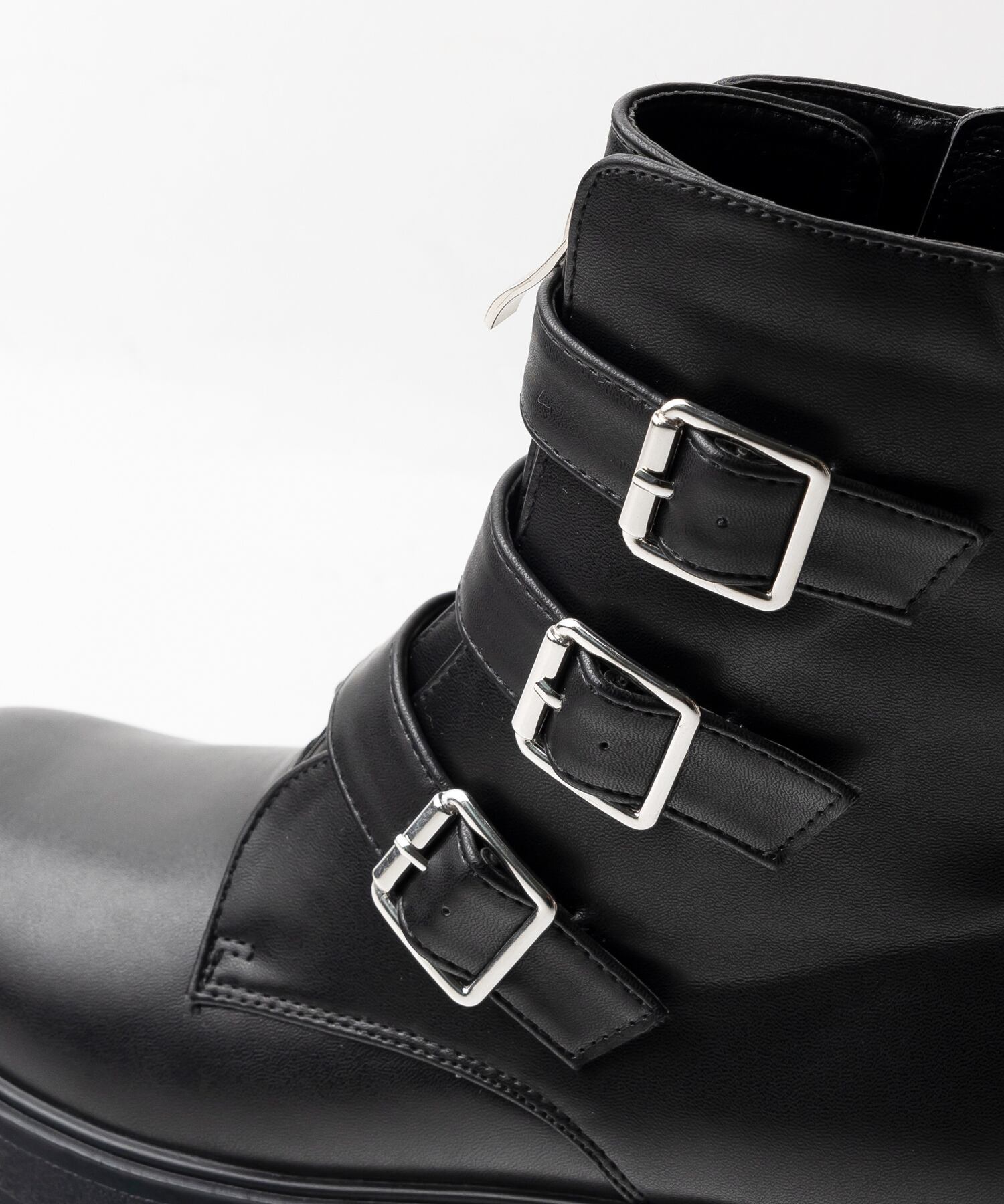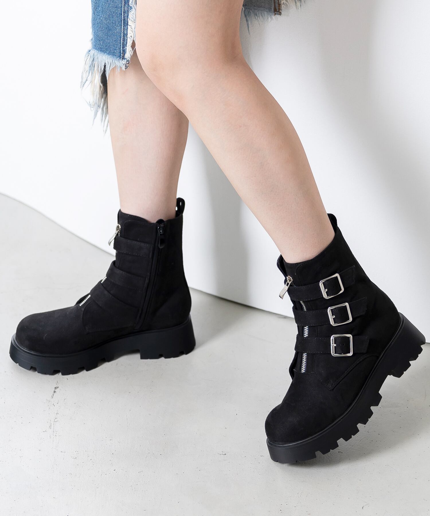 フロントジップと3連ベルトデザインでメンズライクな印象のショートブーツ。