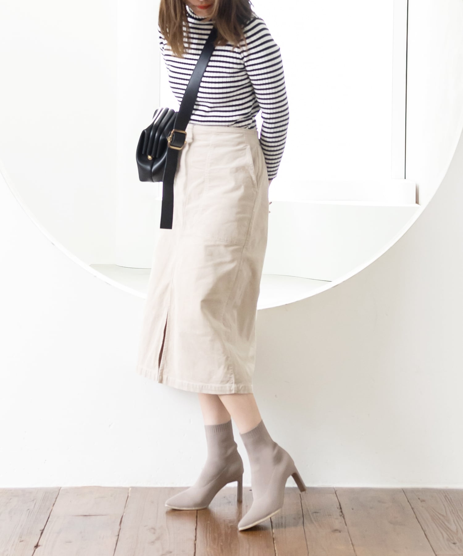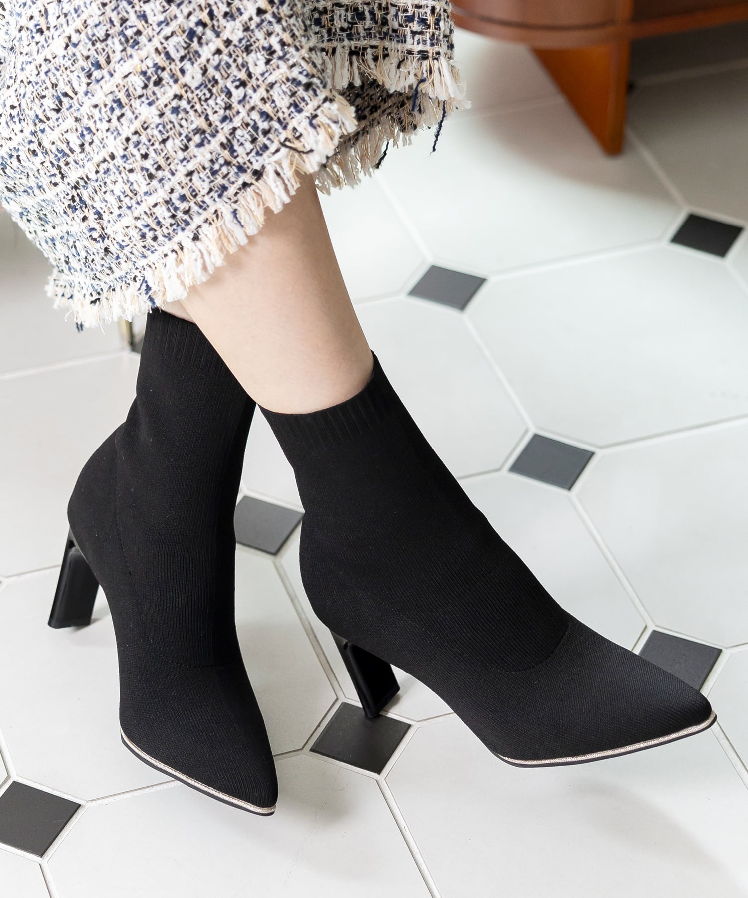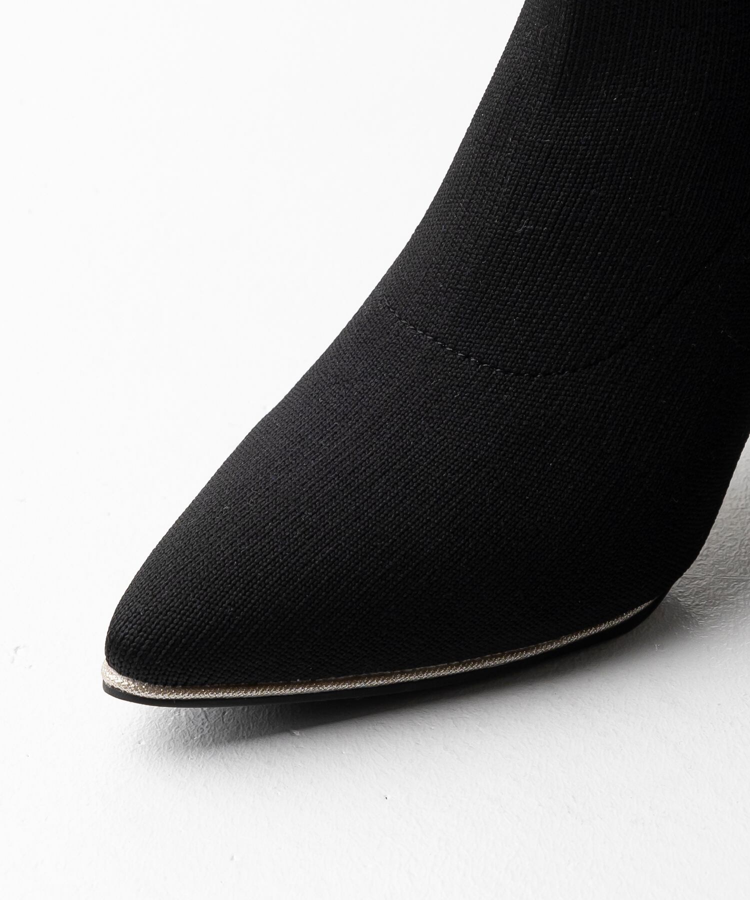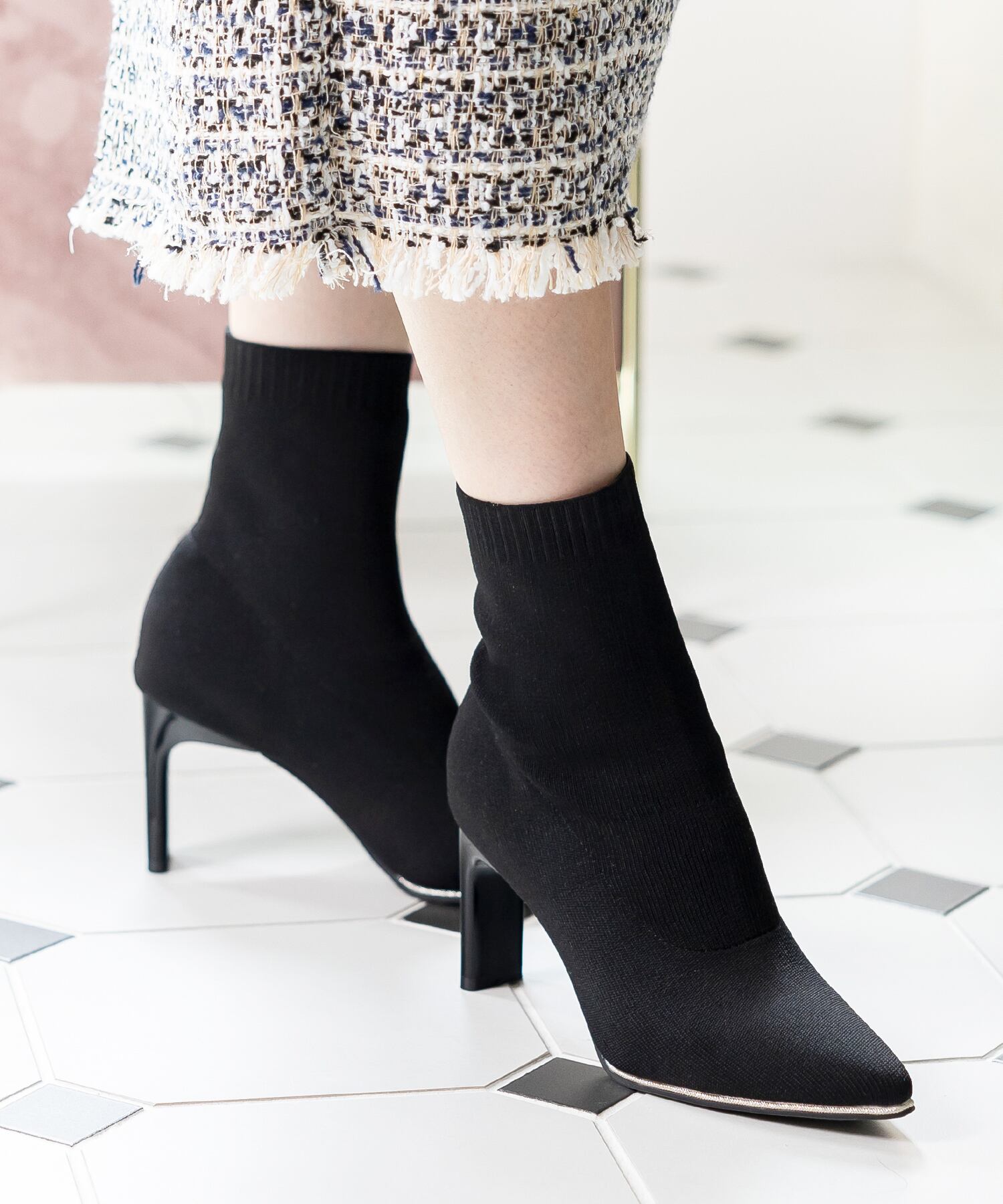 ゴールドのパイピングが上品な印象のソックスブーツ。
