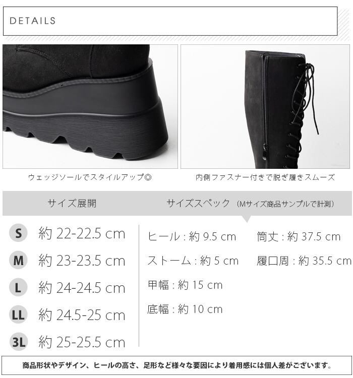 ボリュームたっぷりのウェッジソールとレースアップデザインで足元に存在感を出せるロングブーツ。