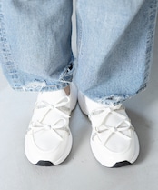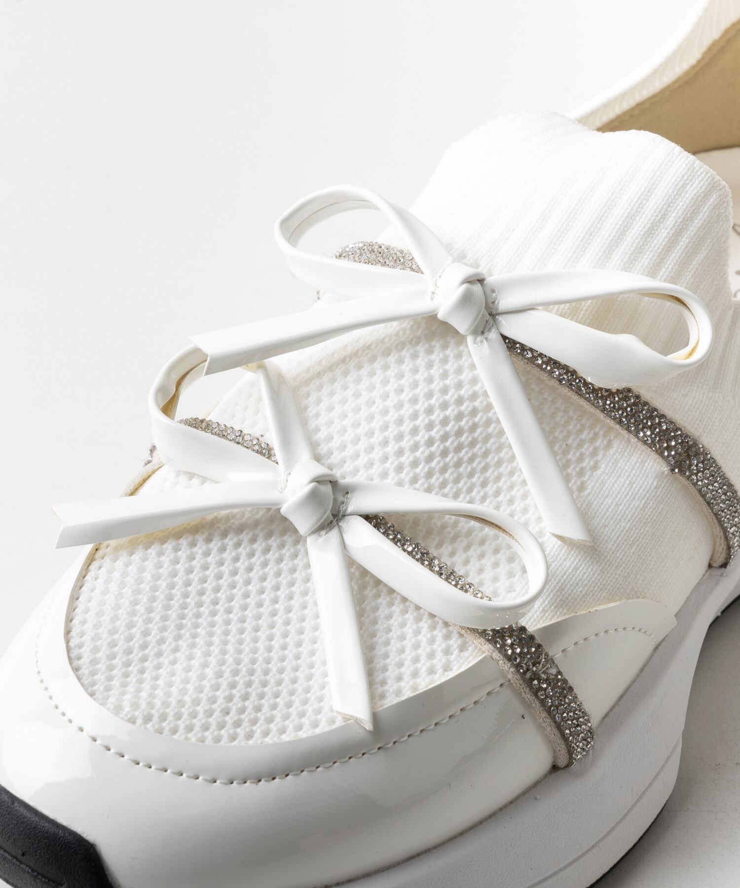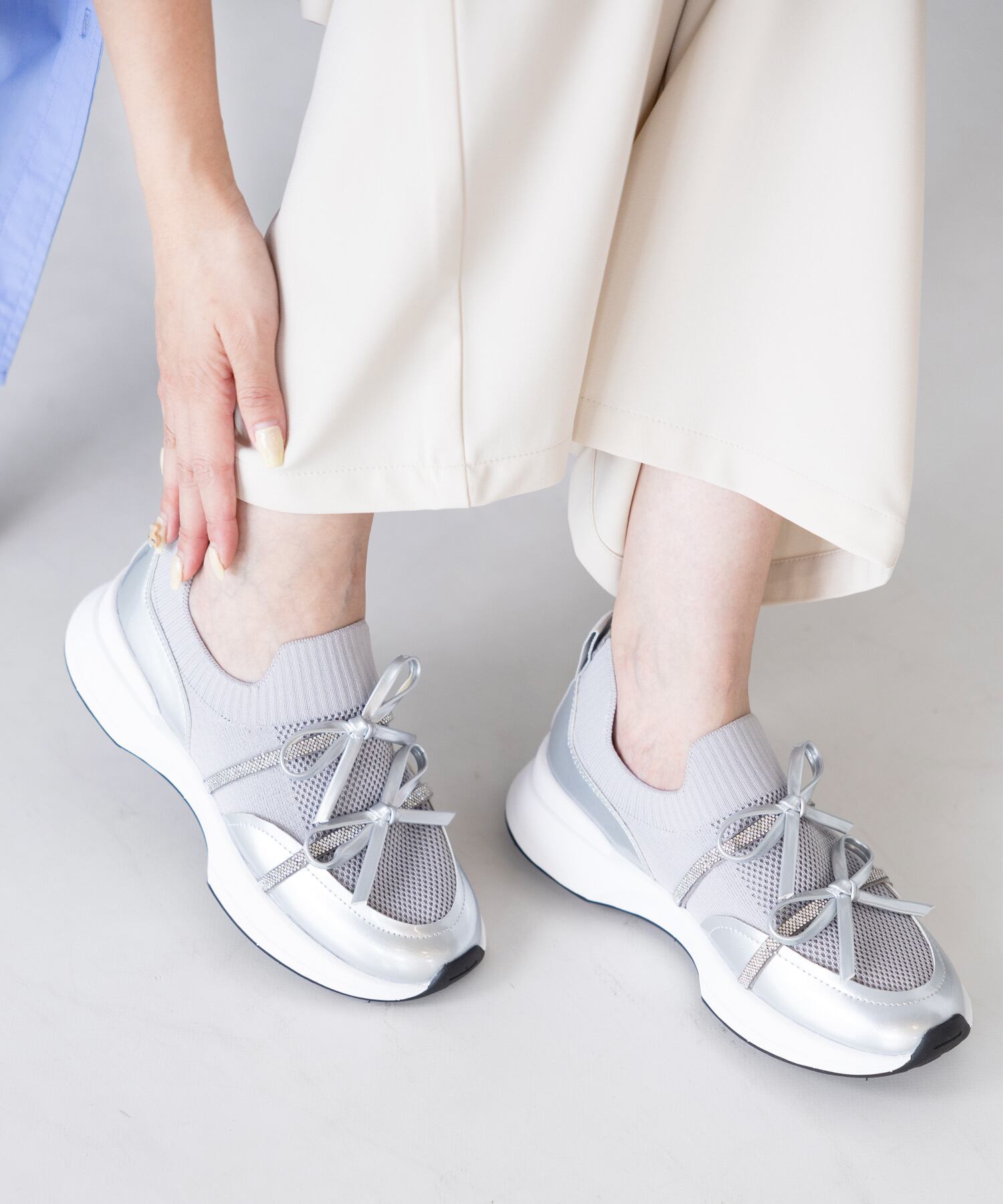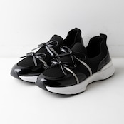 エナメル×ニットの素材ミックスが印象的なスニーカー。