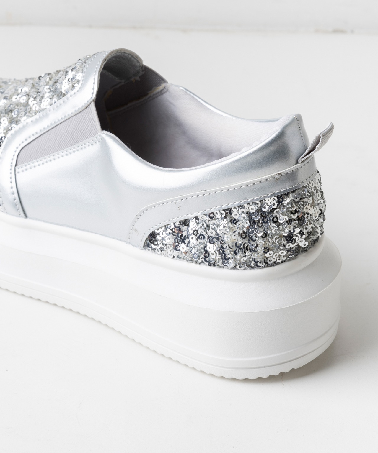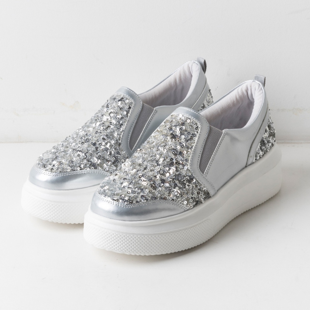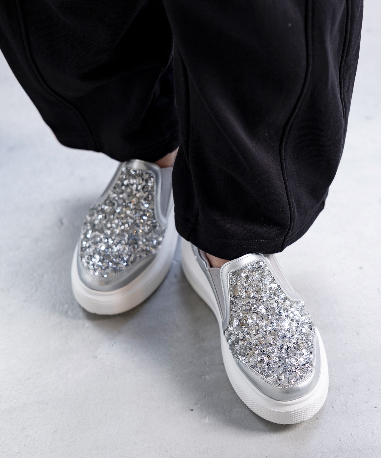 キラキラのスパンコールで存在感のある厚底スニーカー。