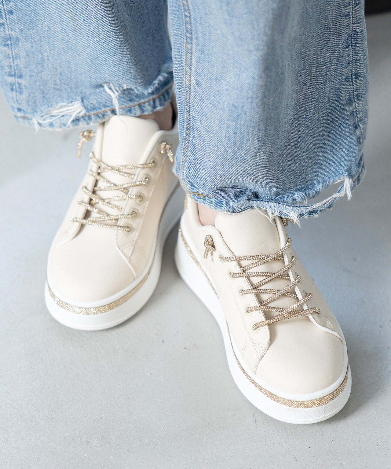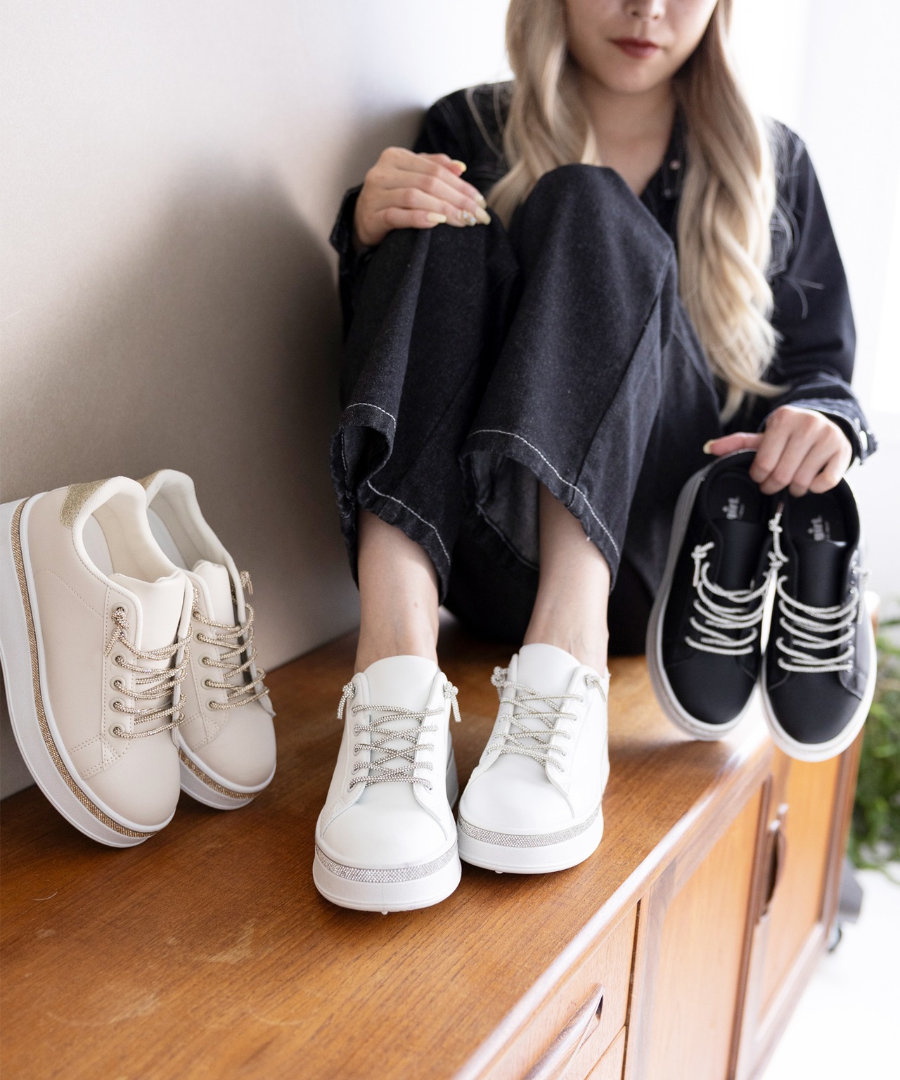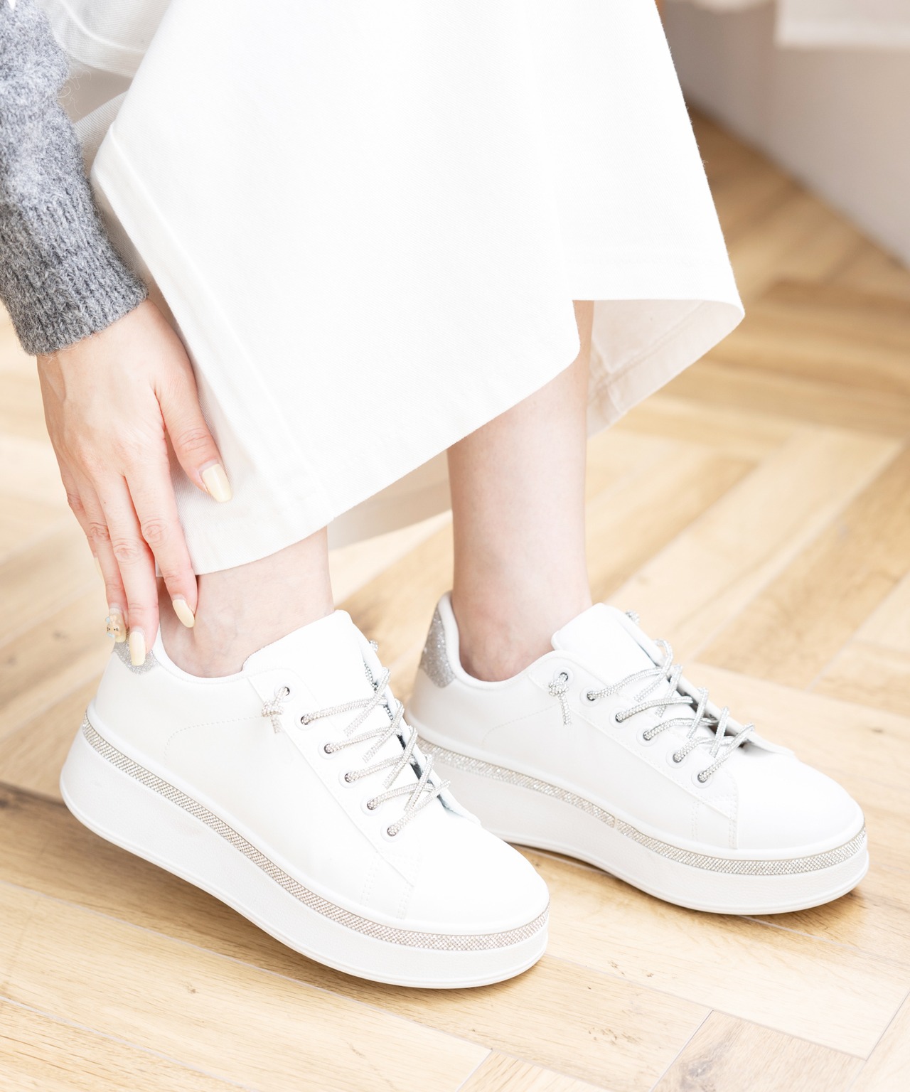 履くだけで足元に華やかさをプラスしてくれる、シンプルなスムース素材にグリッター装飾がアクセントになった厚底スニーカー。