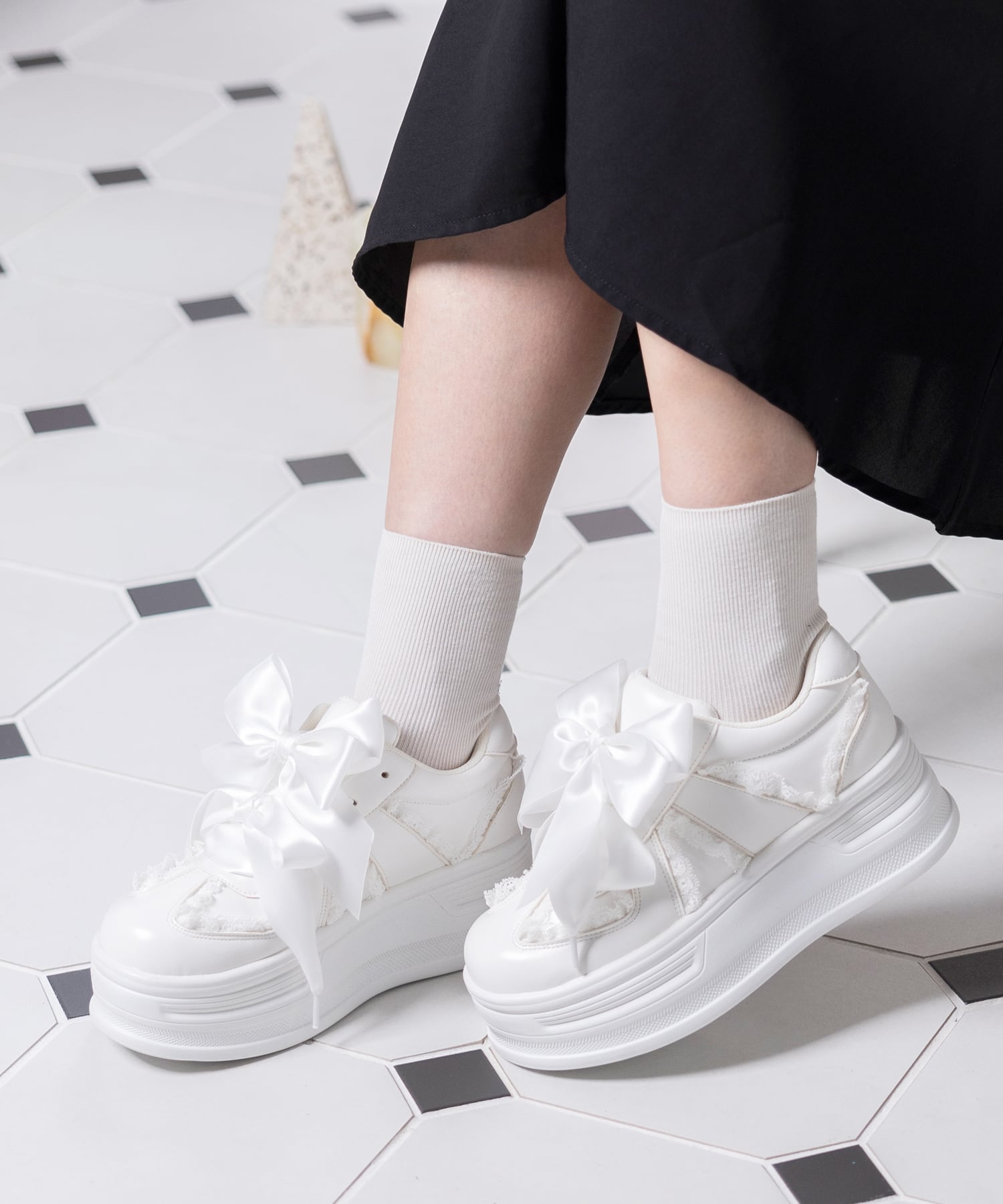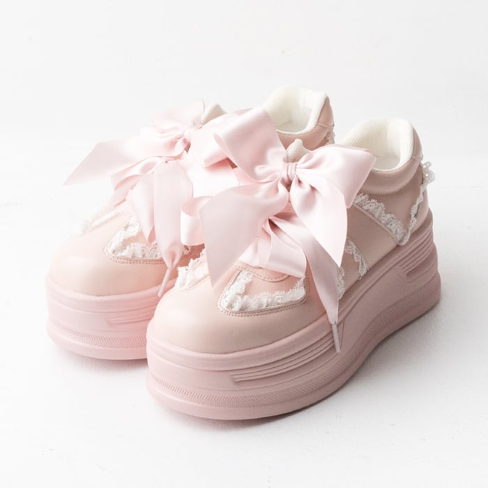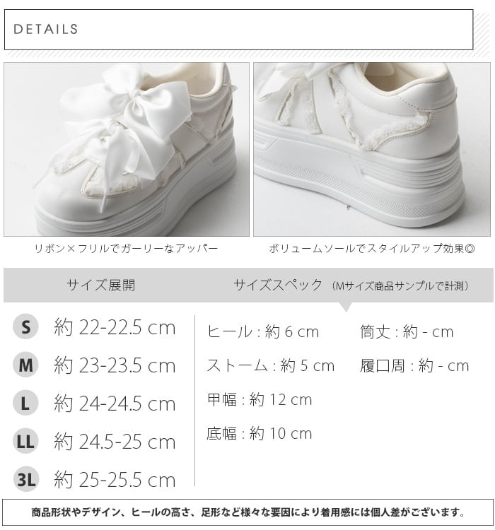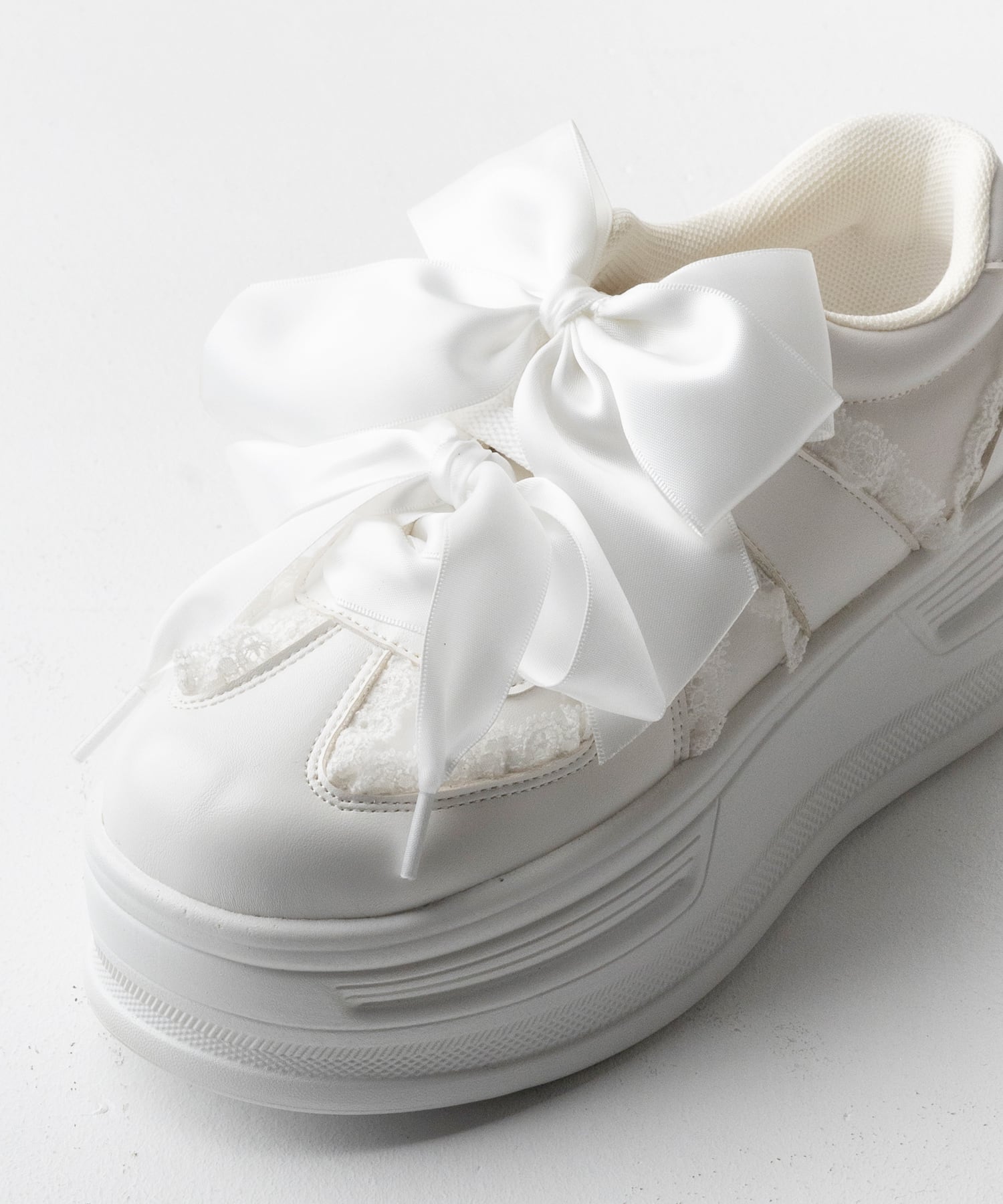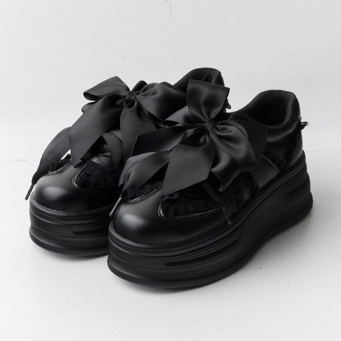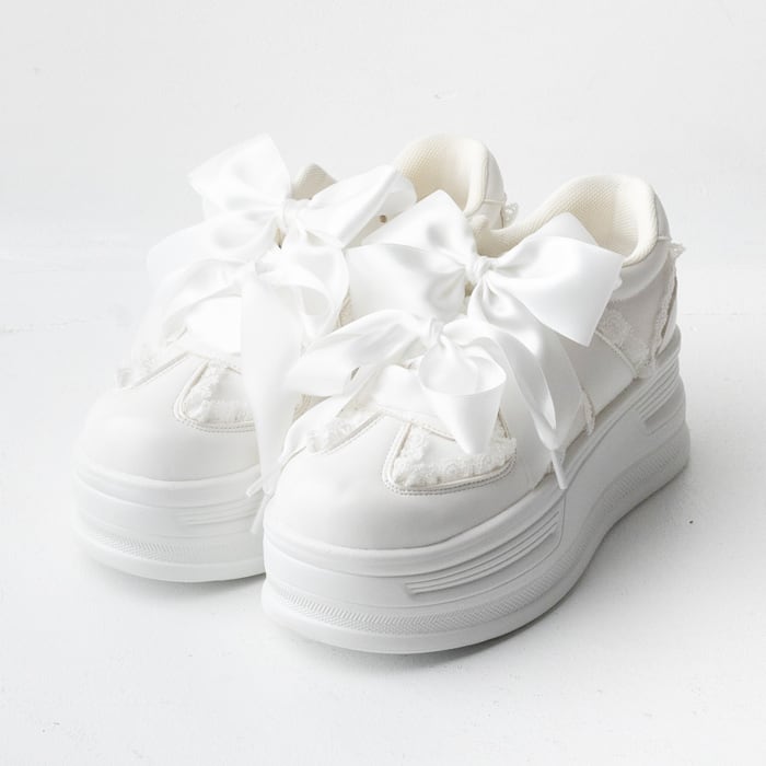 コロンとしたフォルムと大きなリボンがポイントの厚底スニーカー。