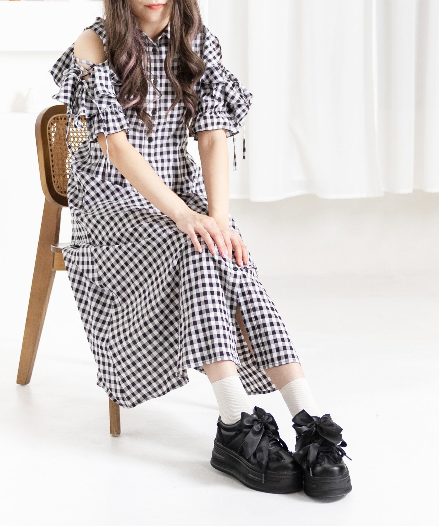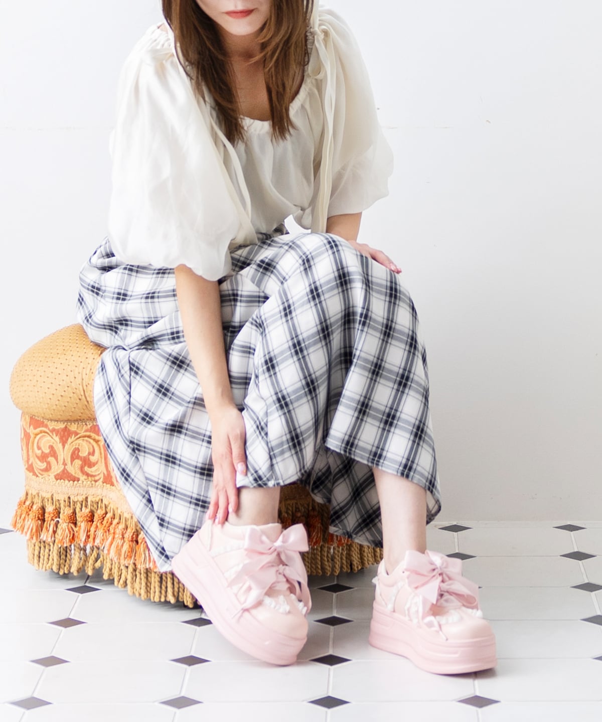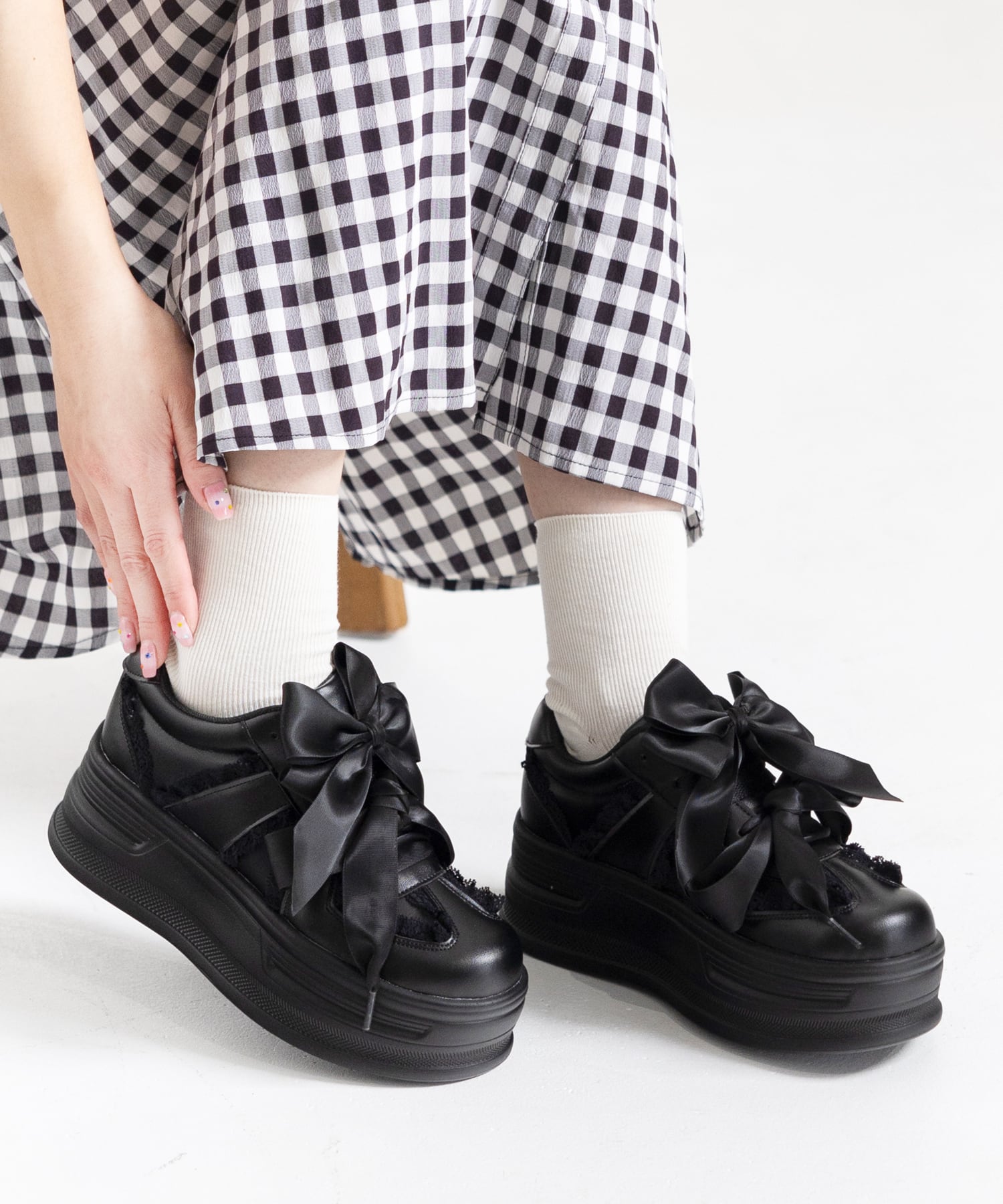 コロンとしたフォルムと大きなリボンがポイントの厚底スニーカー。