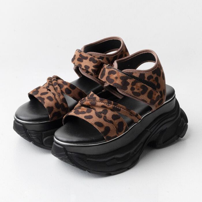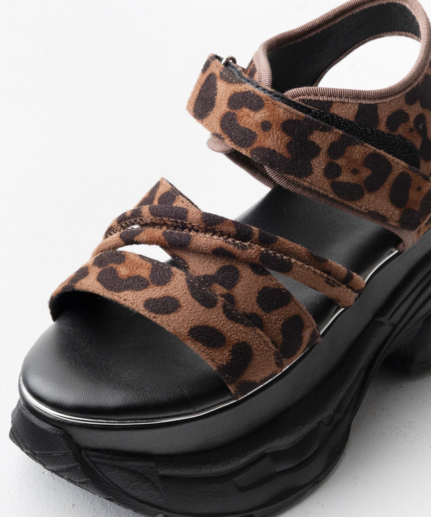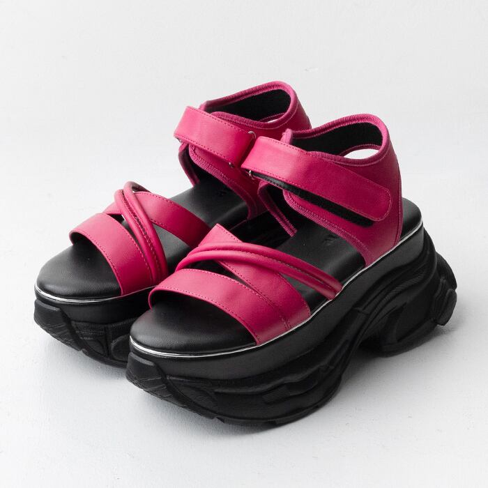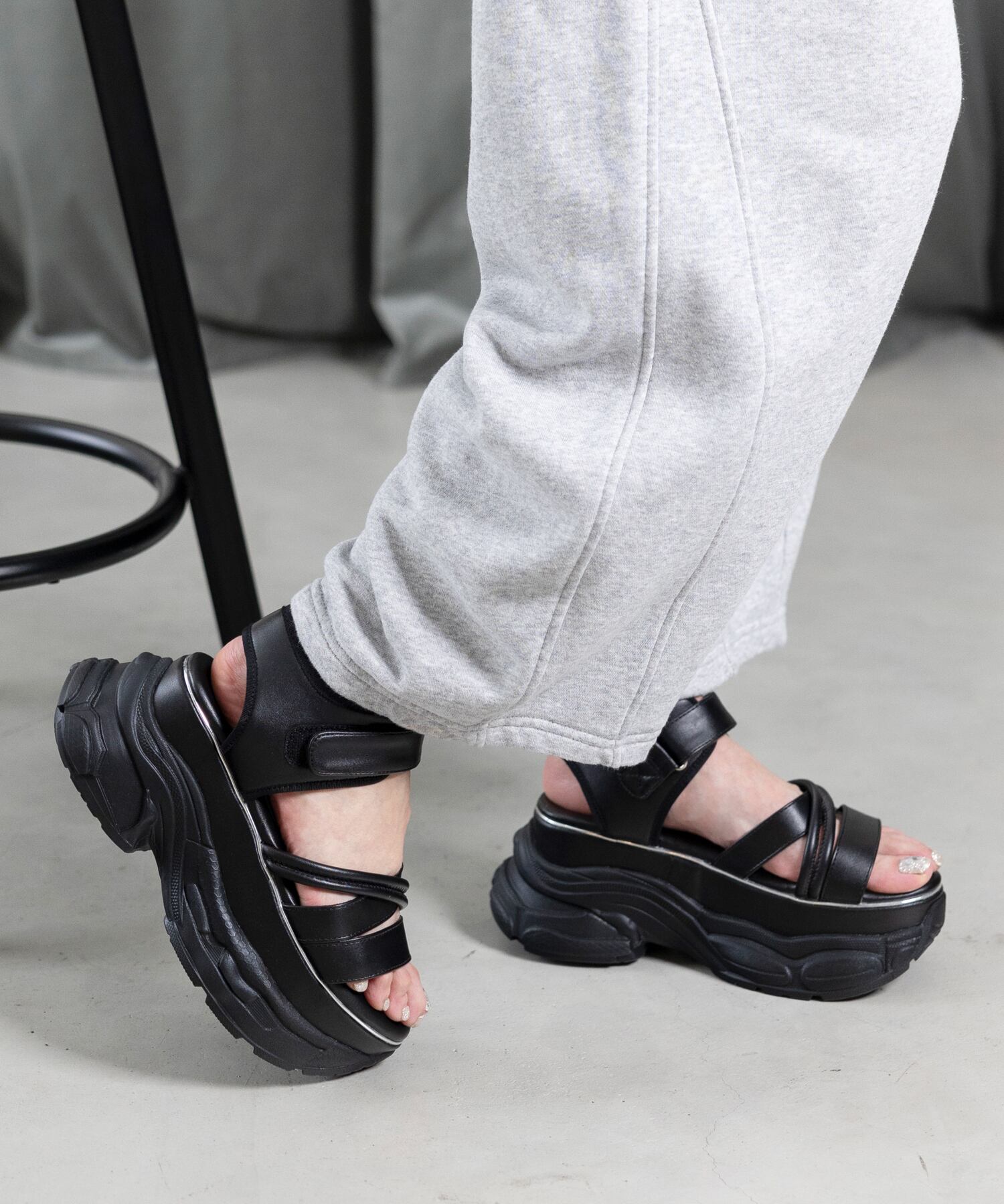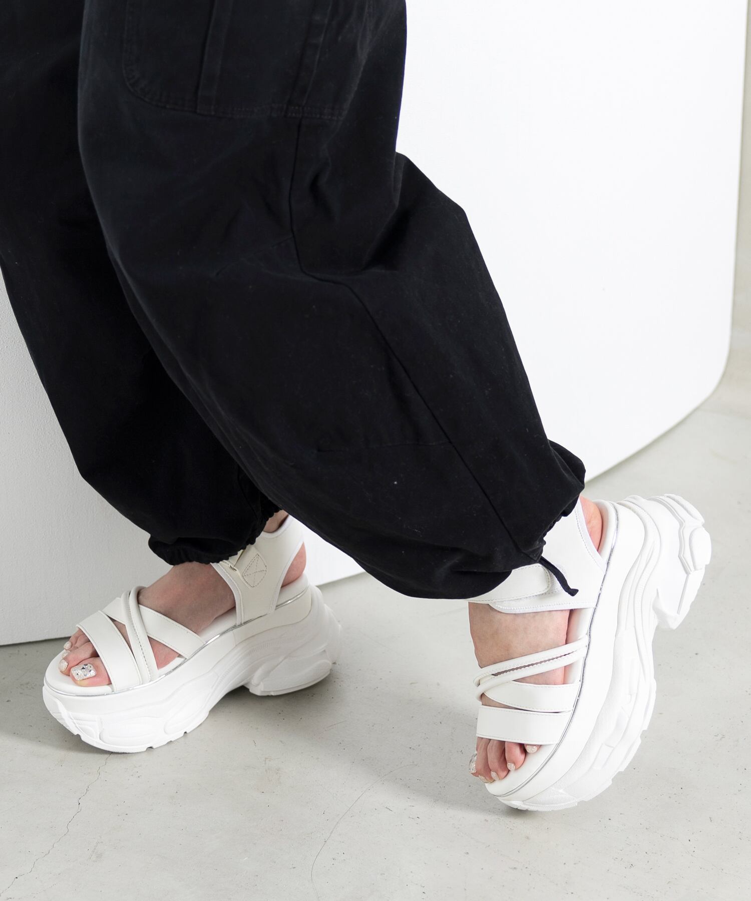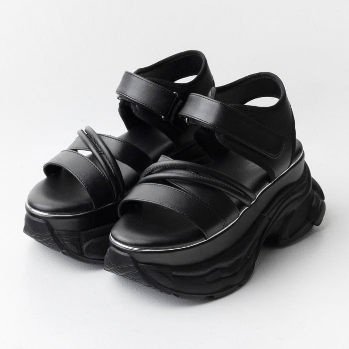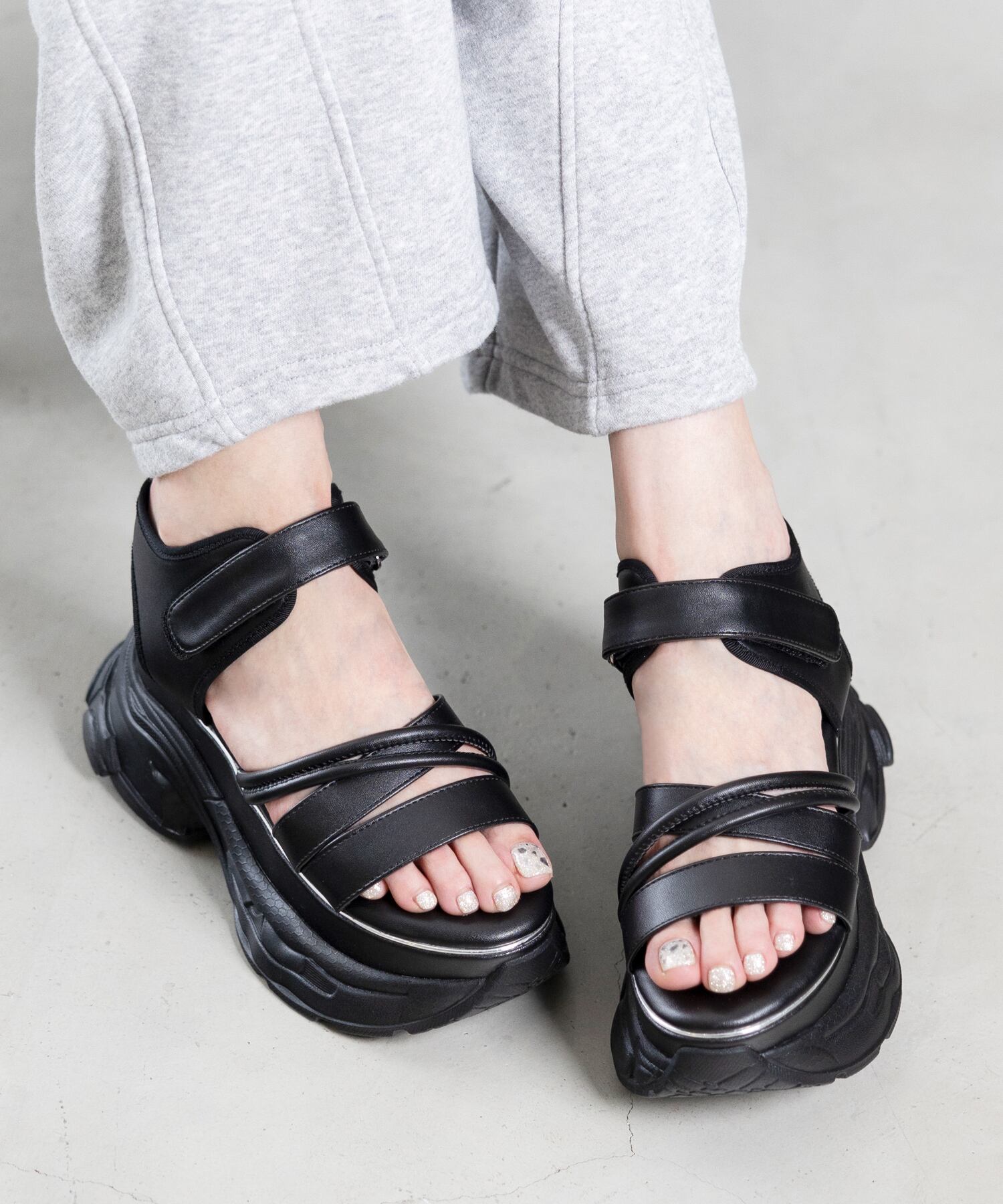 様々な太さのベルトが重なっているのがポイントの厚底サンダル。