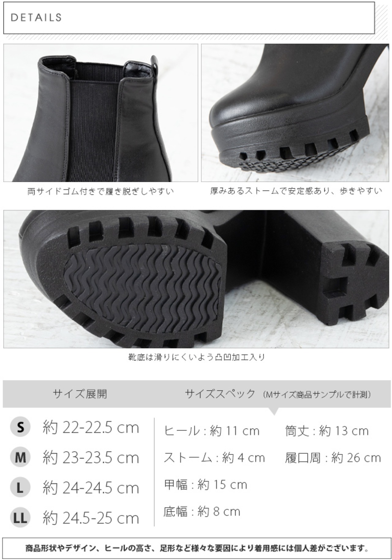 厚底ストーム仕様で高めヒールでも歩きやすいつくりになっています。