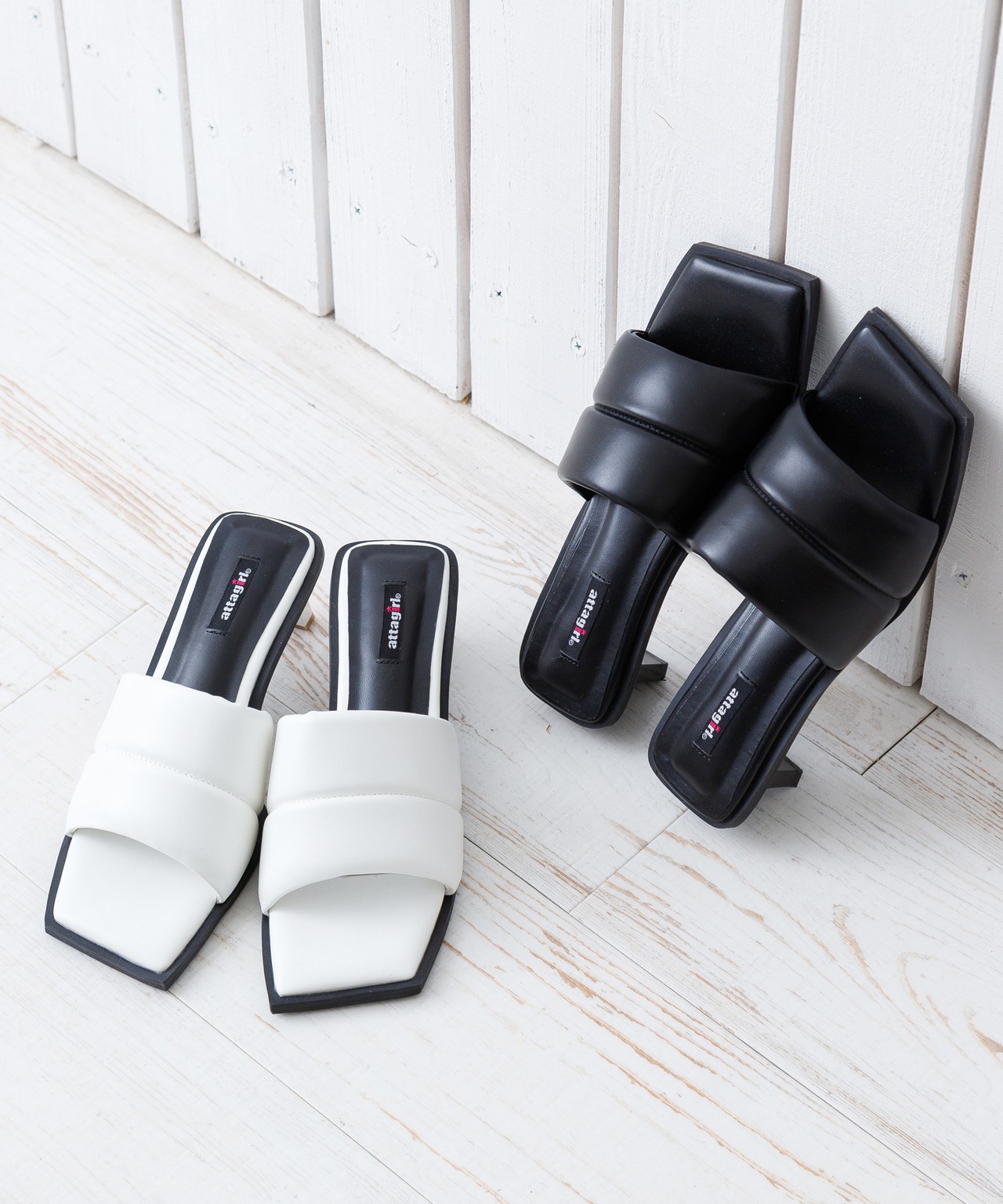 幅広のスクエアトゥと変形ヒールでモード感のあるデザイン。