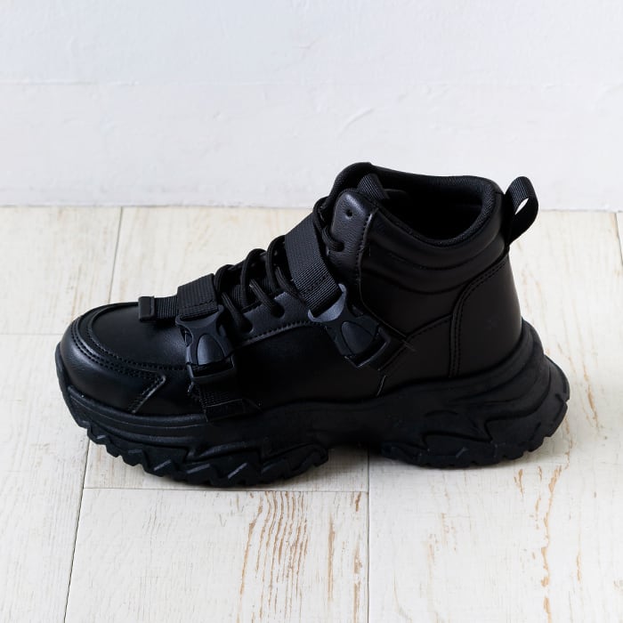 厚底ですが見た目のわりに重くないので長時間履いても疲れません。ハイカットで足首周りがしっかり固定されるので歩きやすいです。