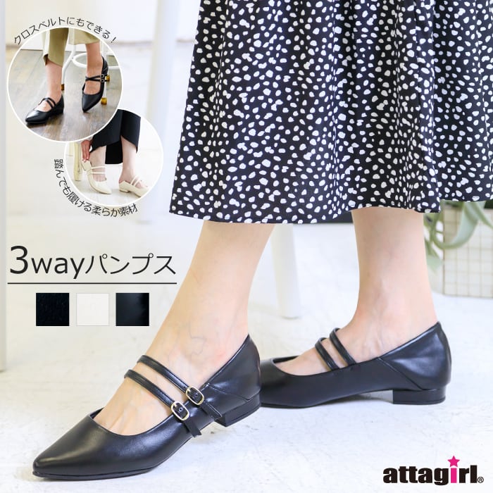 ダブルストラップで歩きやすいローヒールパンプス。