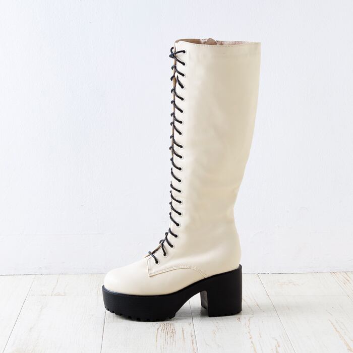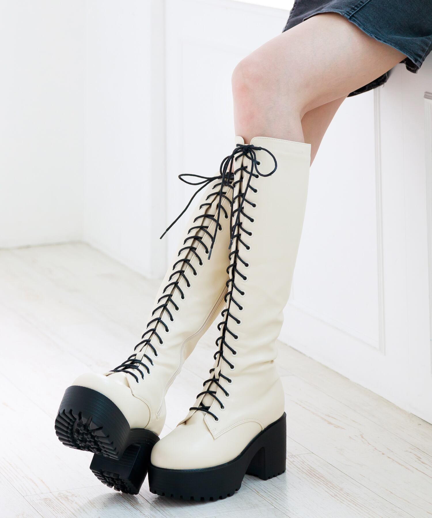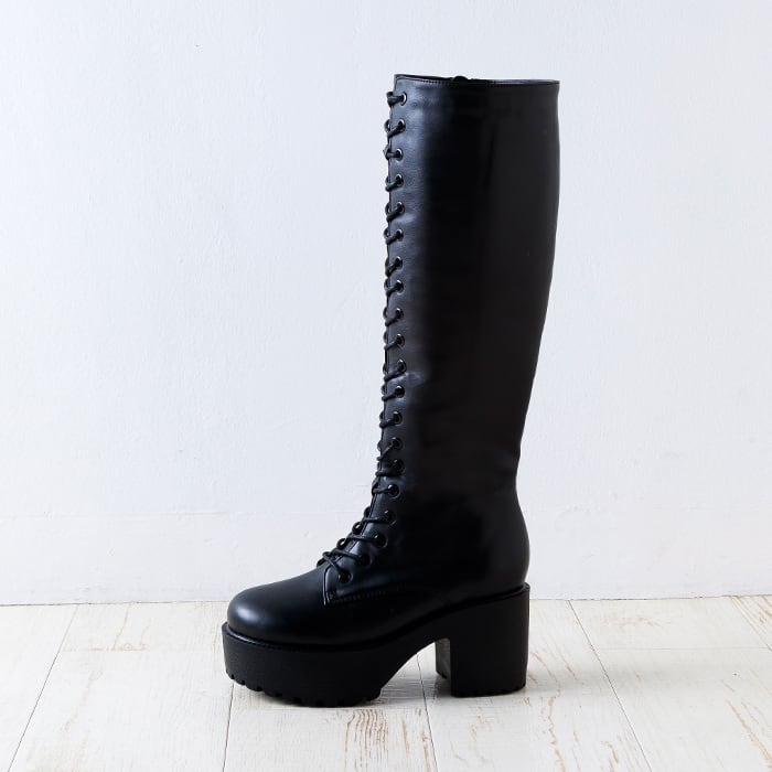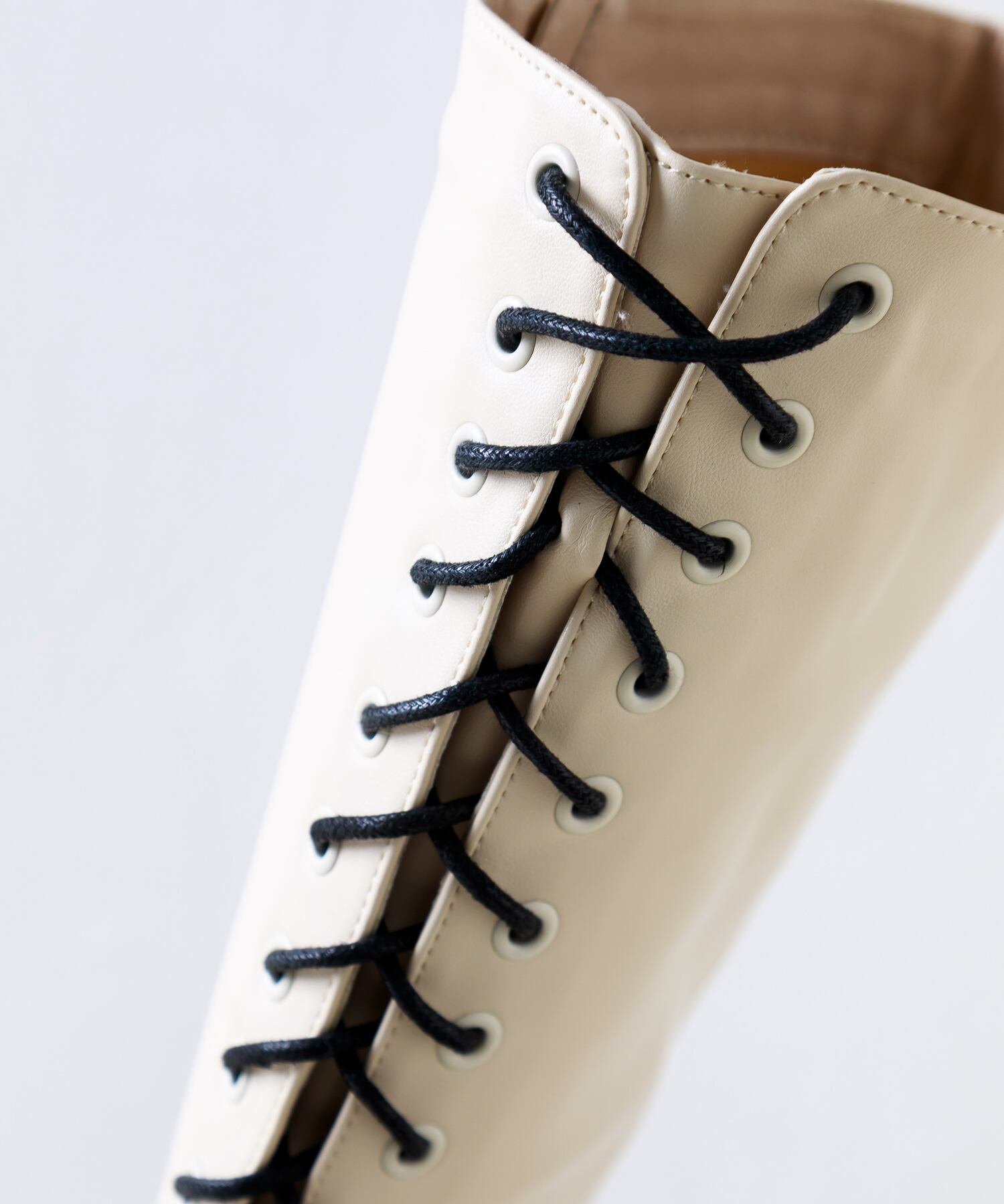 レースアップデザインが特徴的で厚底ソールで程よいボリューム感もある人気のひざ下丈のロングブーツ。
