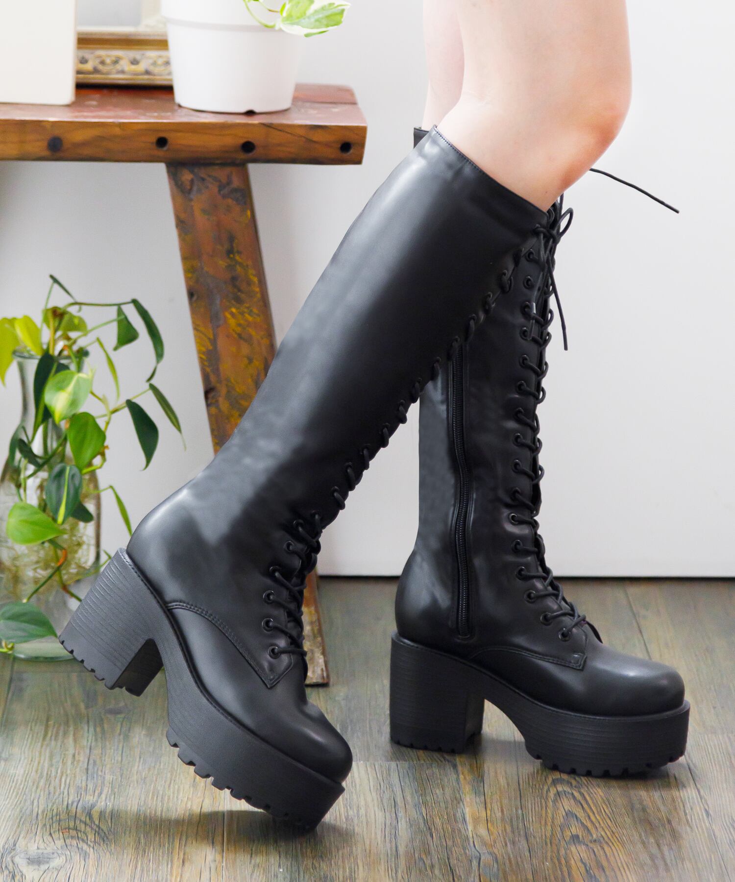 レースアップのデザインはインパクトがあり、普通のロングブーツに飽きた時にもおすすめです。