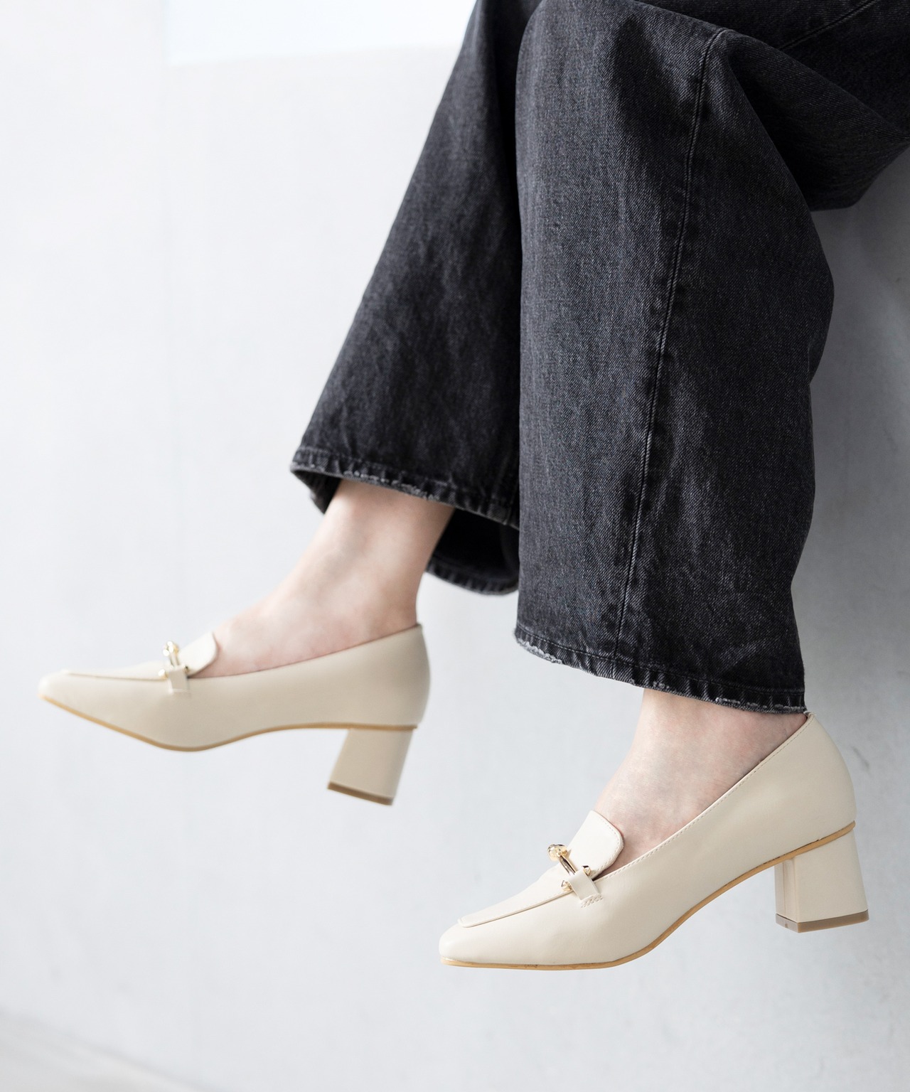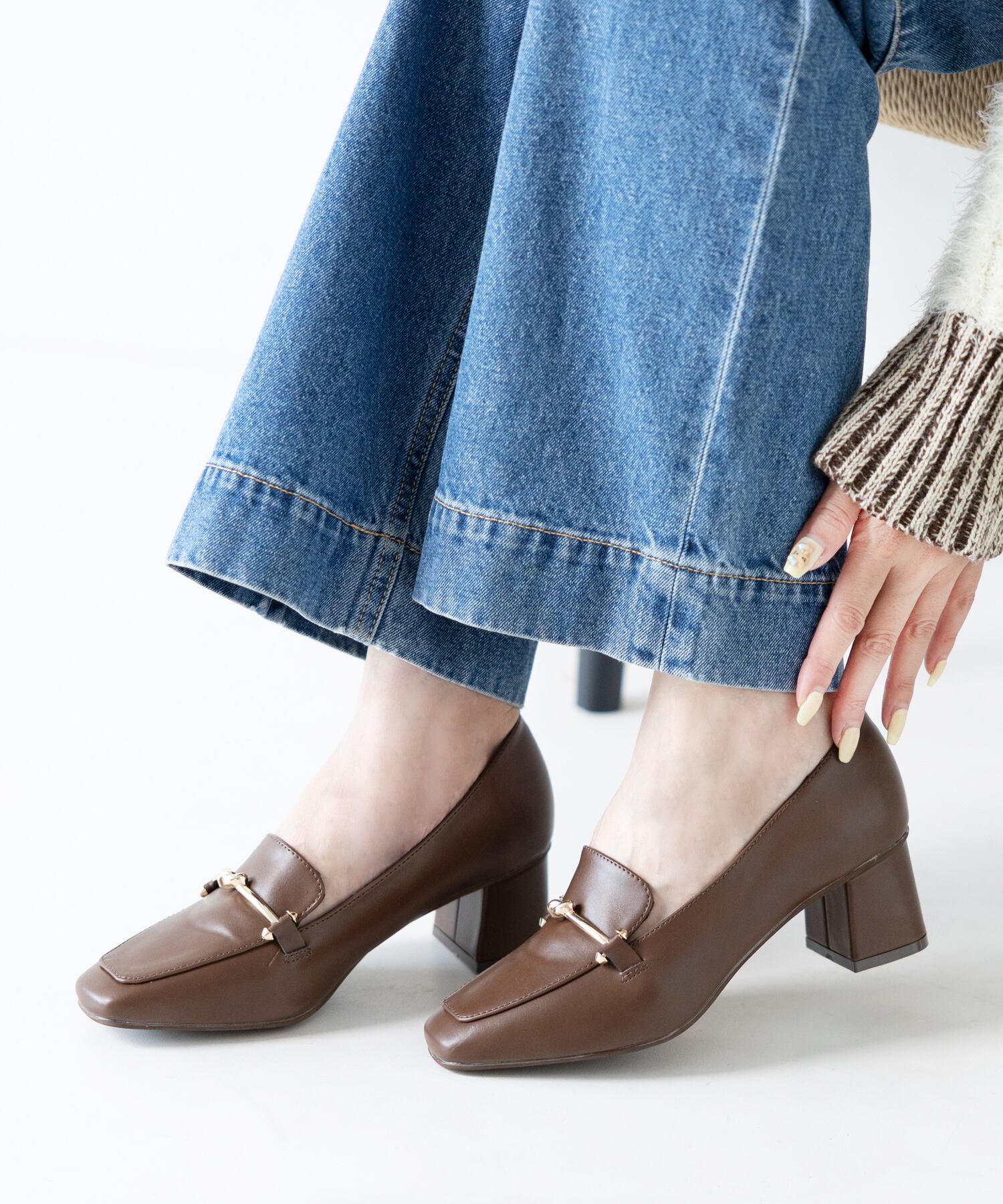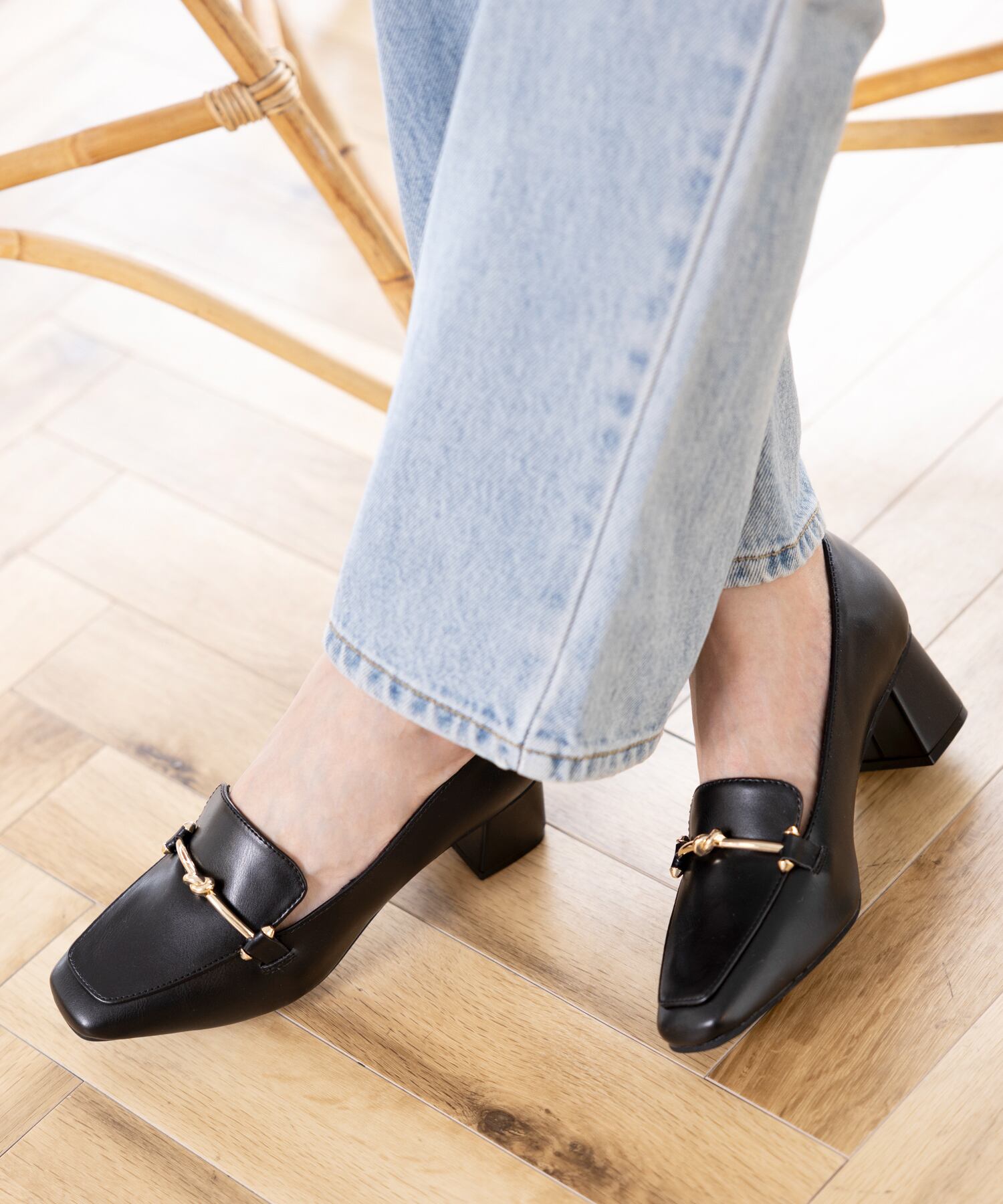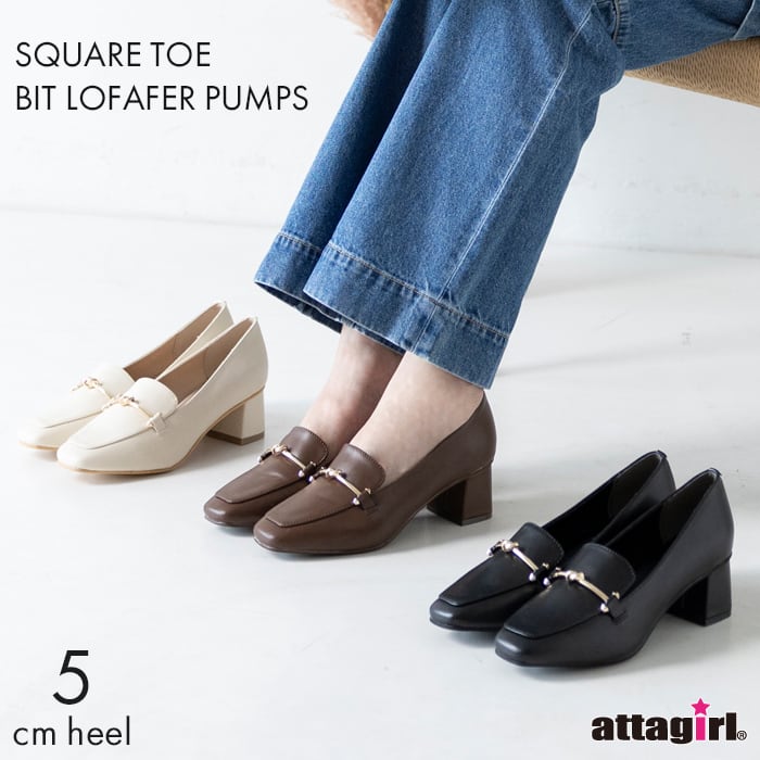 スクエアトゥとブロックヒールで上品なデザインのローファーパンプス。