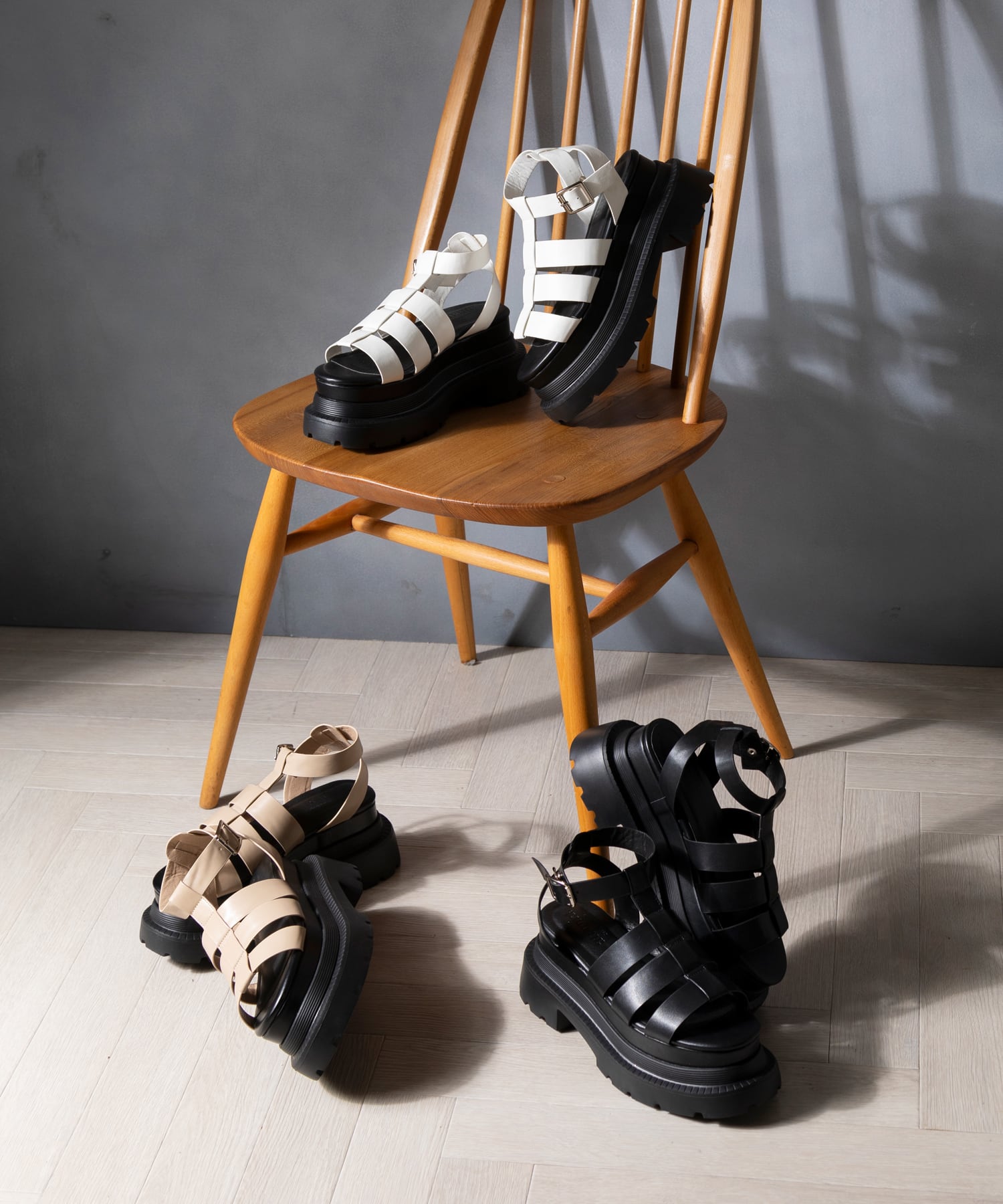 存在感のあるボリュームソールでトレンド感のあるグルカサンダル。