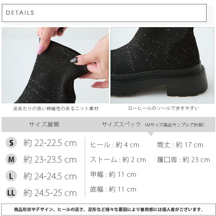 柔らかいニットが足全体にフィットして靴擦れの心配なく履けます。<br>厚底過ぎず、ぺたんこ過ぎないちょうど良い厚みのソールで足が痛くなりにくいです。