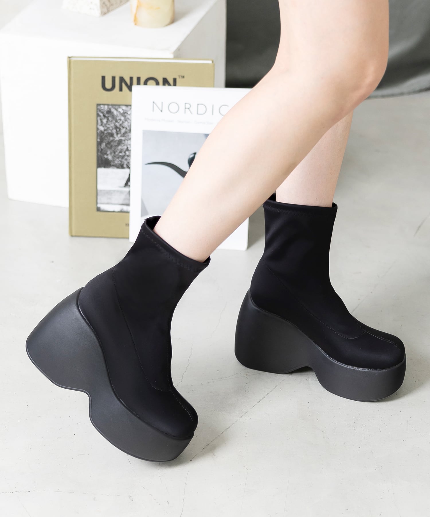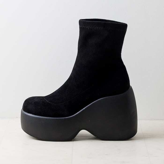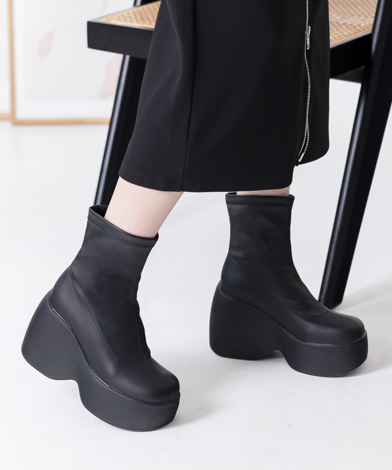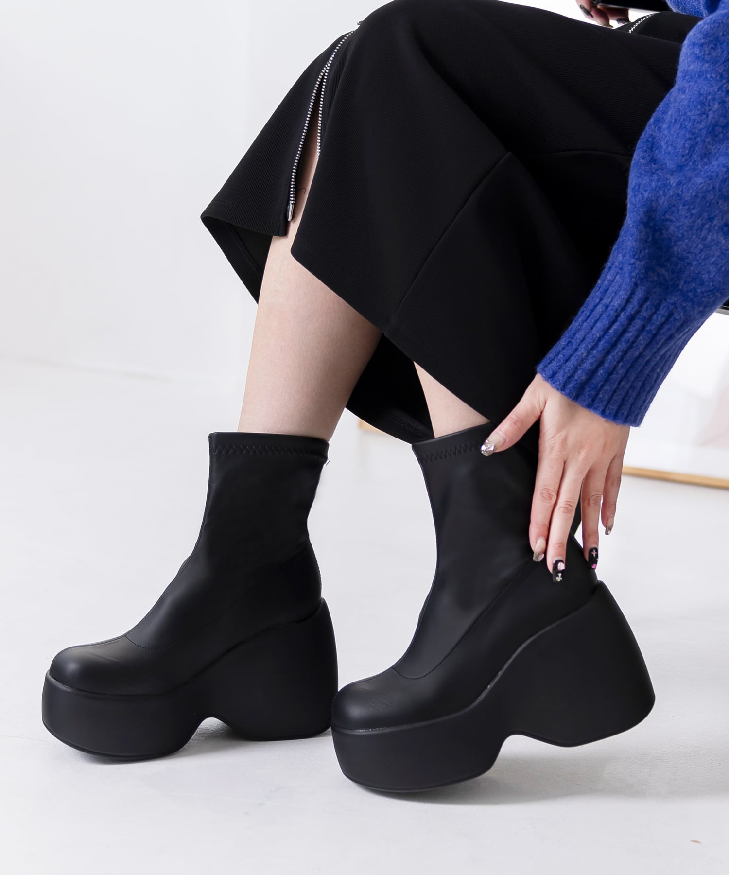 存在感抜群のボリュームソールがトレンド感のあるクールでモードなストレッチブーツ。