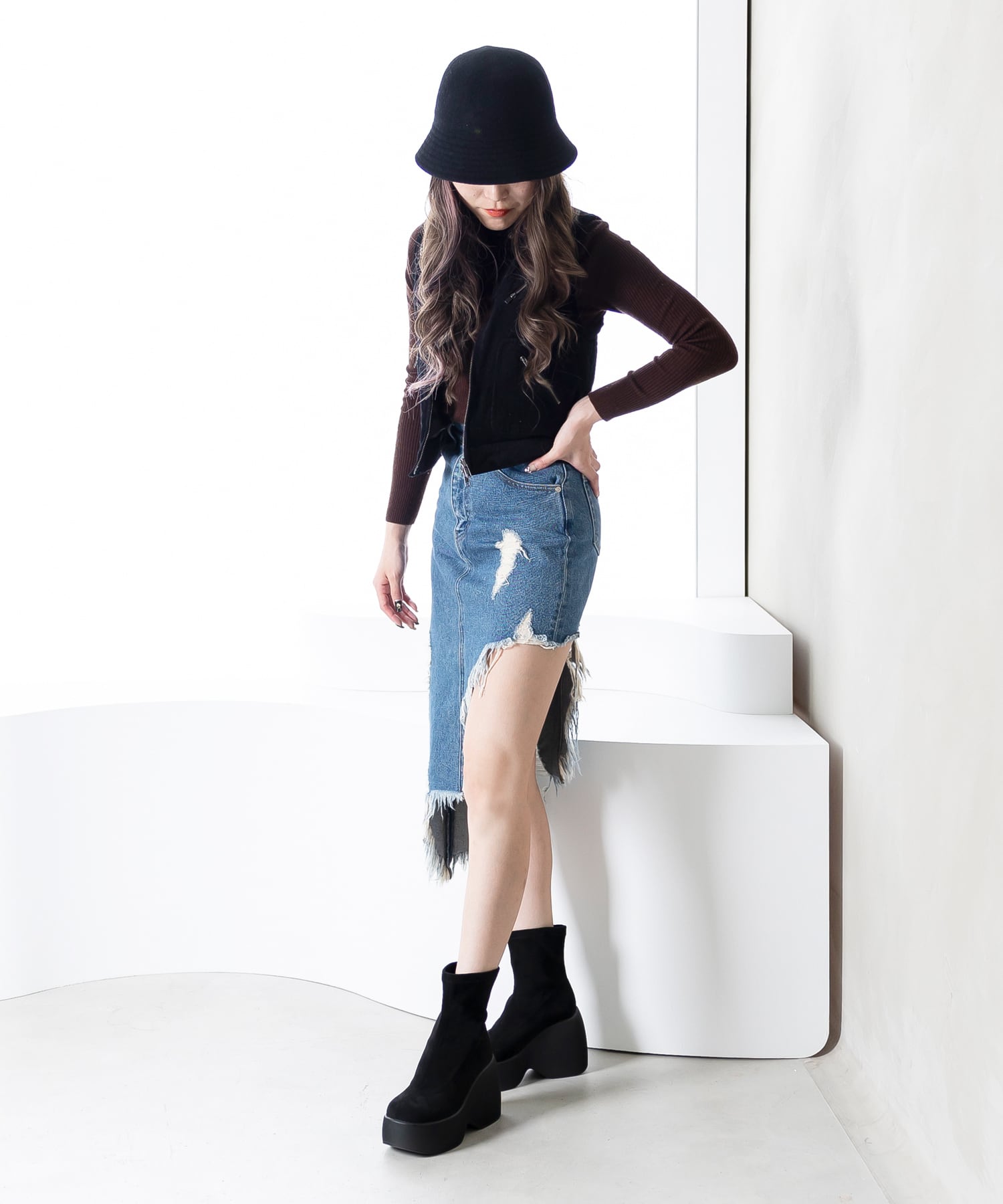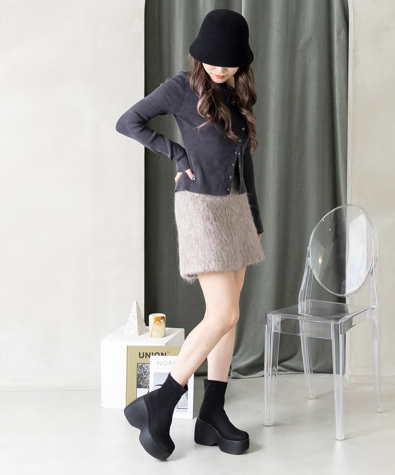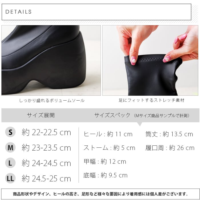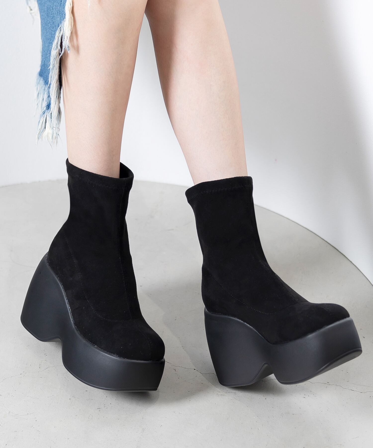 存在感抜群のボリュームソールがトレンド感のあるクールでモードなストレッチブーツ。