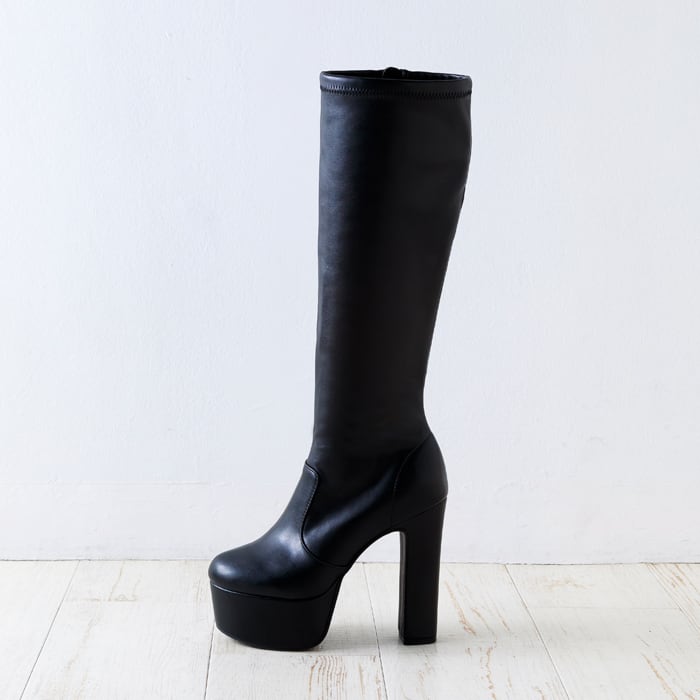 ストレッチ感のある素材でフィット感良く、内側ファスナーなのもポイント。太めなヒールも安定感があって履きやすいブーツです。