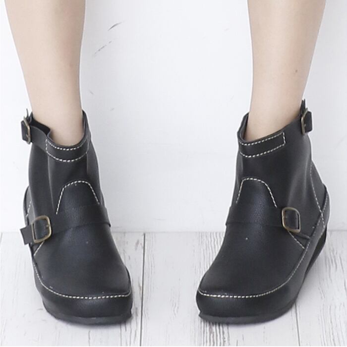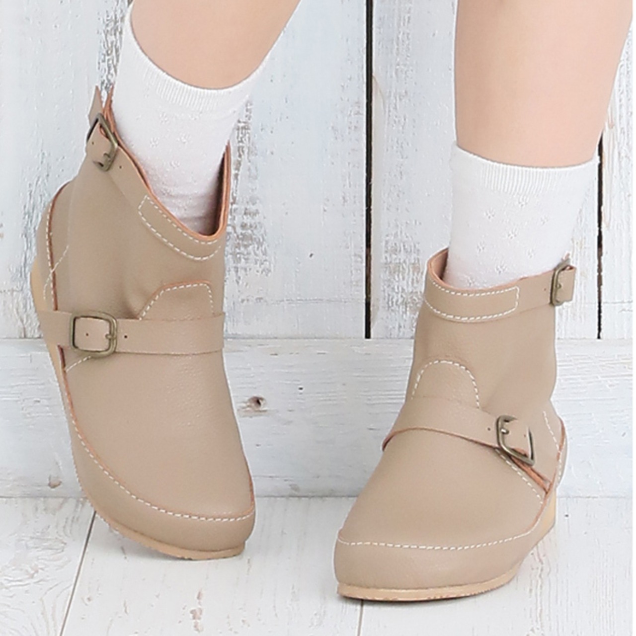 飾りステッチやダブルベルトがアクセントとなったショートブーツです。