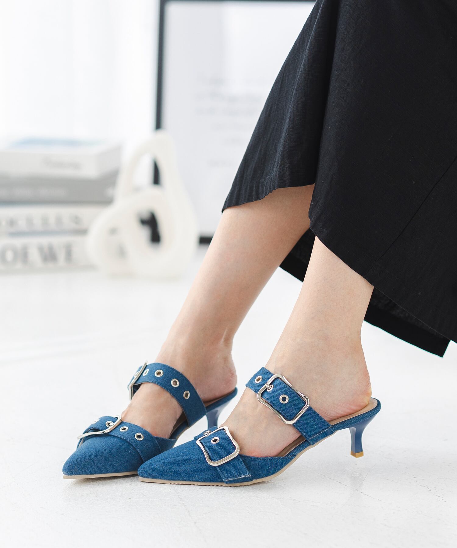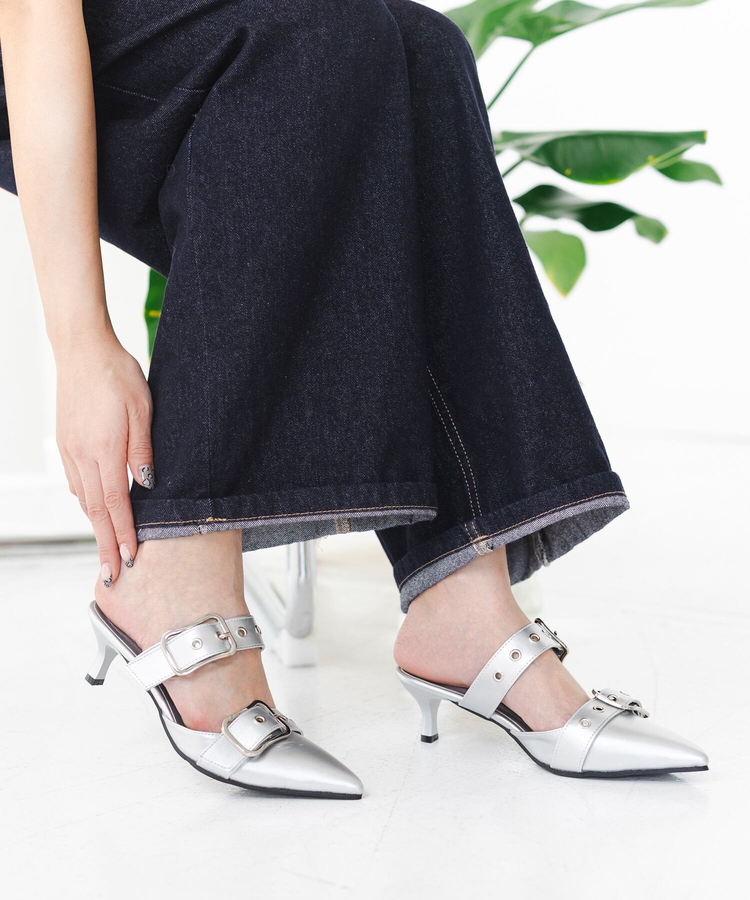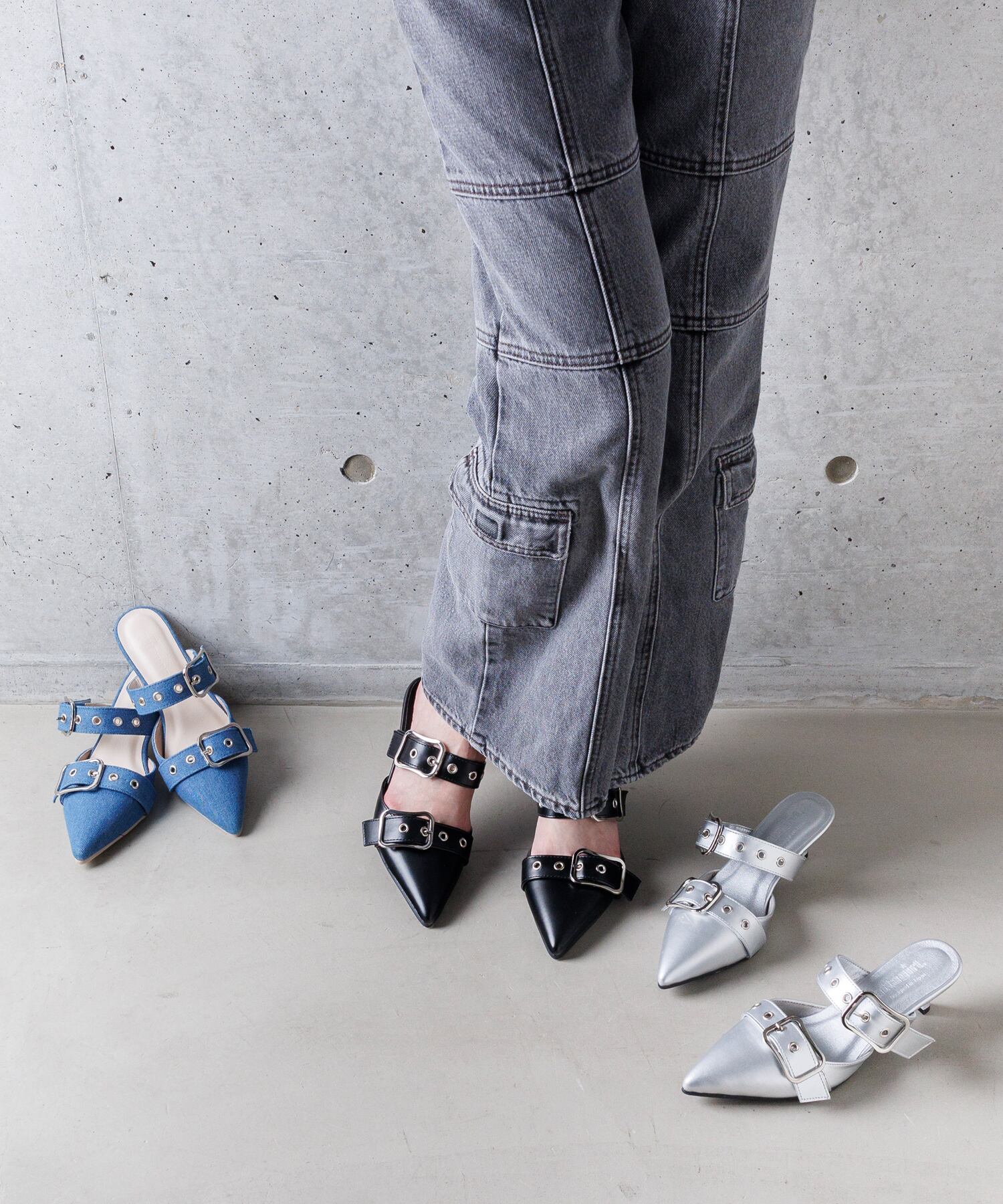 すっきりとしたポインテッドトゥとアッパーのベルトでスタイリッシュな印象に。