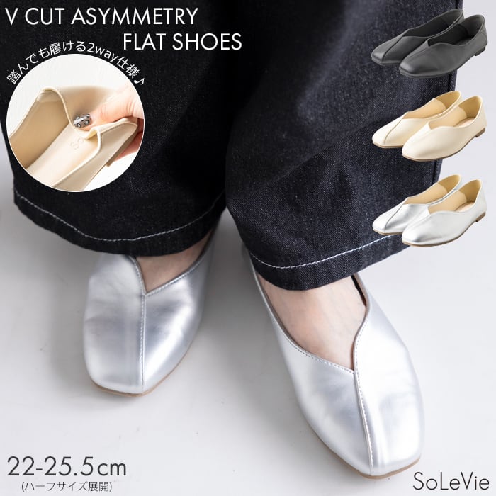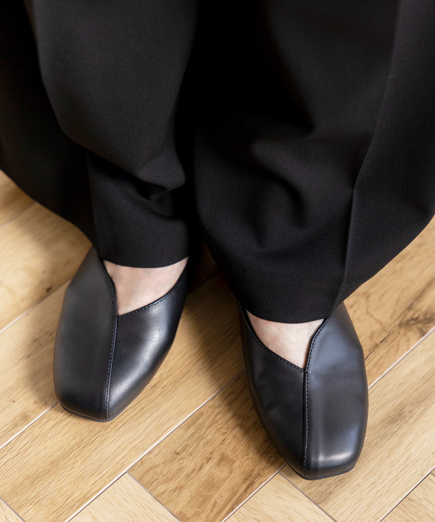 Vカットとスクエアトゥの組み合わせで大人な雰囲気のフラットシューズ。