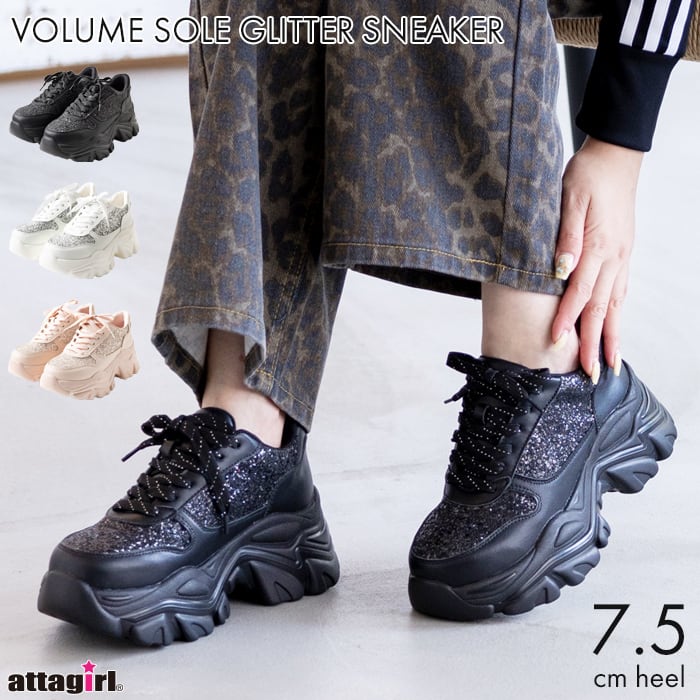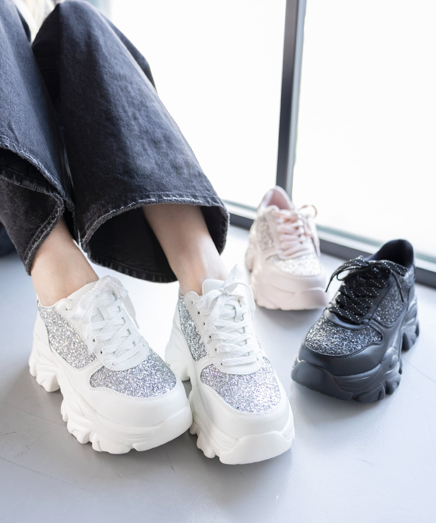 キラキラのグリッター素材が目を引く厚底スニーカー。